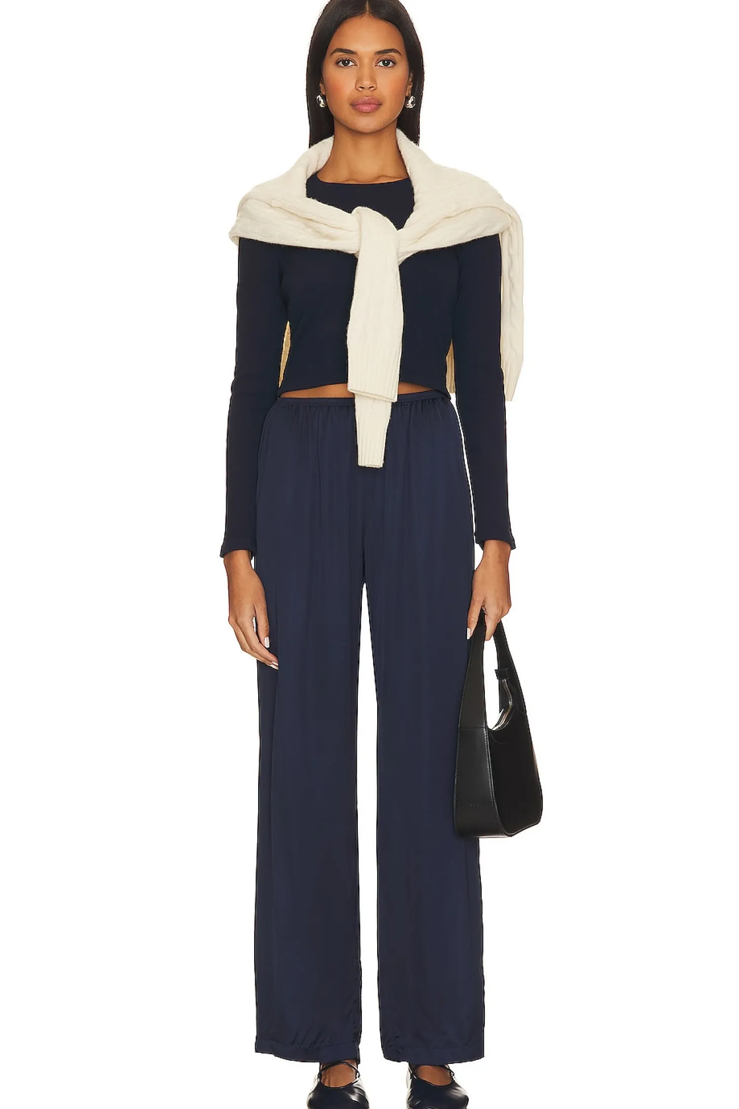 100% viscose.Made in USA.Dry clean only.Elastic waistband.Lightweight sateen fabric.20" at the knee and 20" at the leg opening