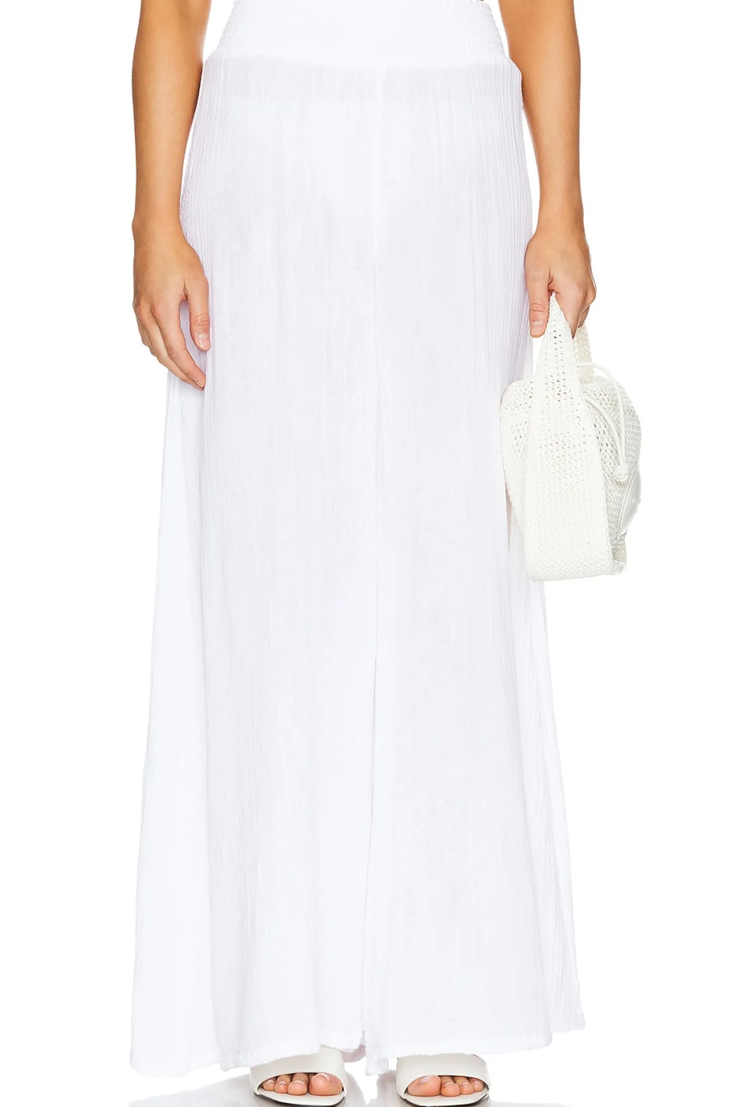 100% cotton.Made in USA.Machine wash.Elastic waistband.32" at the knee and breaks to 45" at the leg opening