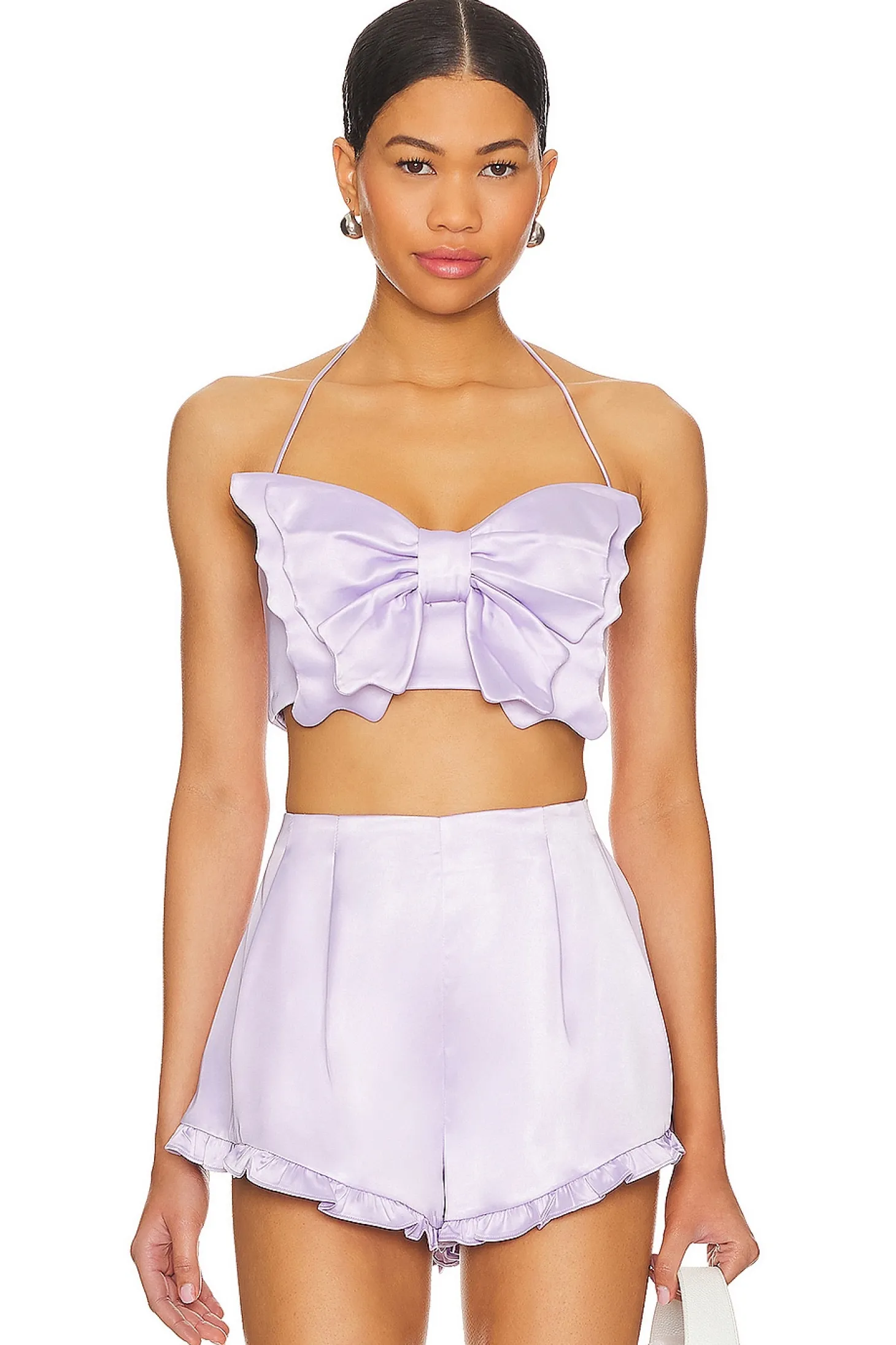 Unveiling the MAJORELLE Siren Top in a dreamy Powder Purple shade. This satin crop top is designed for playful charm, featuring a flattering halterneck styling. Paired with matching shorts, it creates a cohesive and girly ensemble that's perfect for embracing the warm weather..97% polyester 3% elastane.Made in China.Hand wash.Hidden back zipper closure.Boned sides.Satin fabric.Item not sold as a set