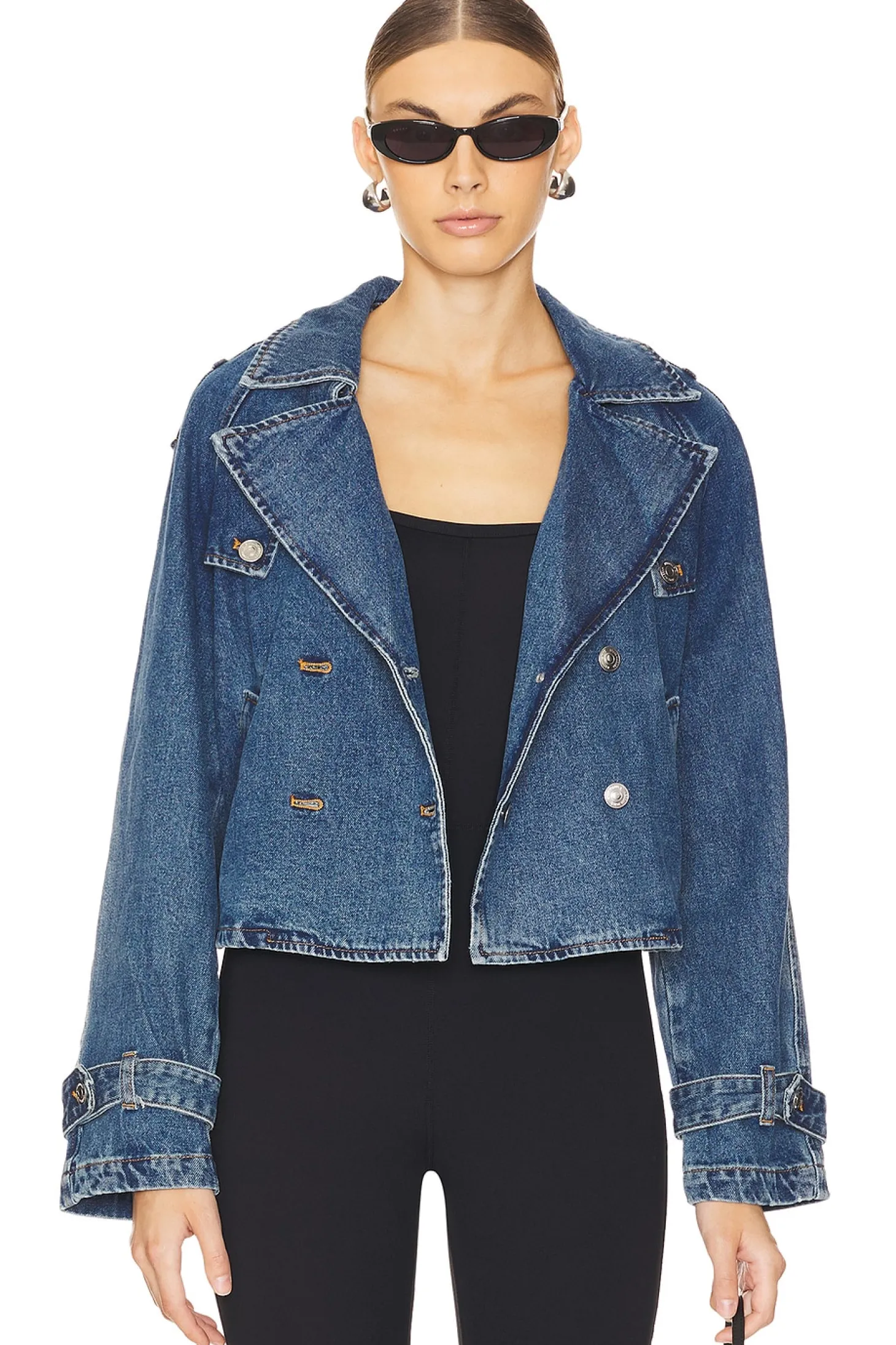 73% cotton 18% rayon 9% polyester.Made in China.Machine wash.Dual-breasted front button closure.Side slant pockets.Rigid denim with button tabs