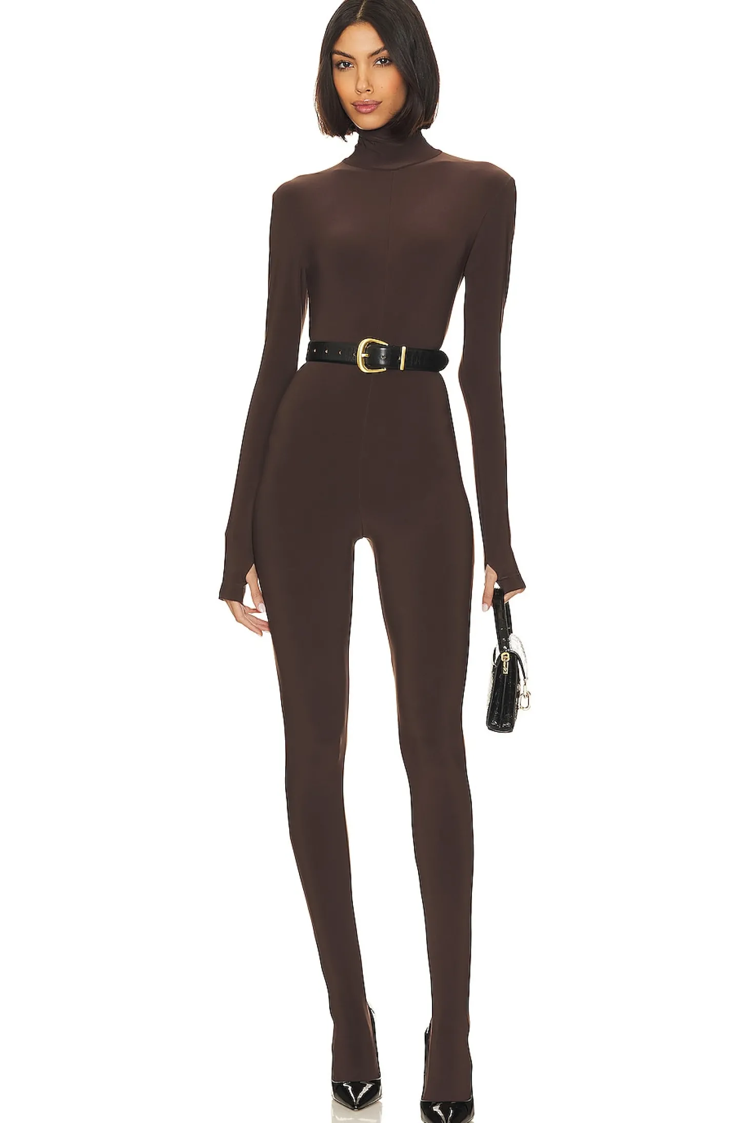 Turn heads with Norma Kamali's Slim Fit Turtle Catsuit in Chocolate. This alluring piece features turtleneck styling, attached sock foot, and a thumbhole design . Pair it with black pumps and the perfect belt for a sensational night out..95% polyester 5% spandex.Made in China.Hand wash.Hidden back zipper closure.Turtleneck styling and thumbhole design.Attached sock foot Jersey fabric Please note belt not included.style runs large, size down