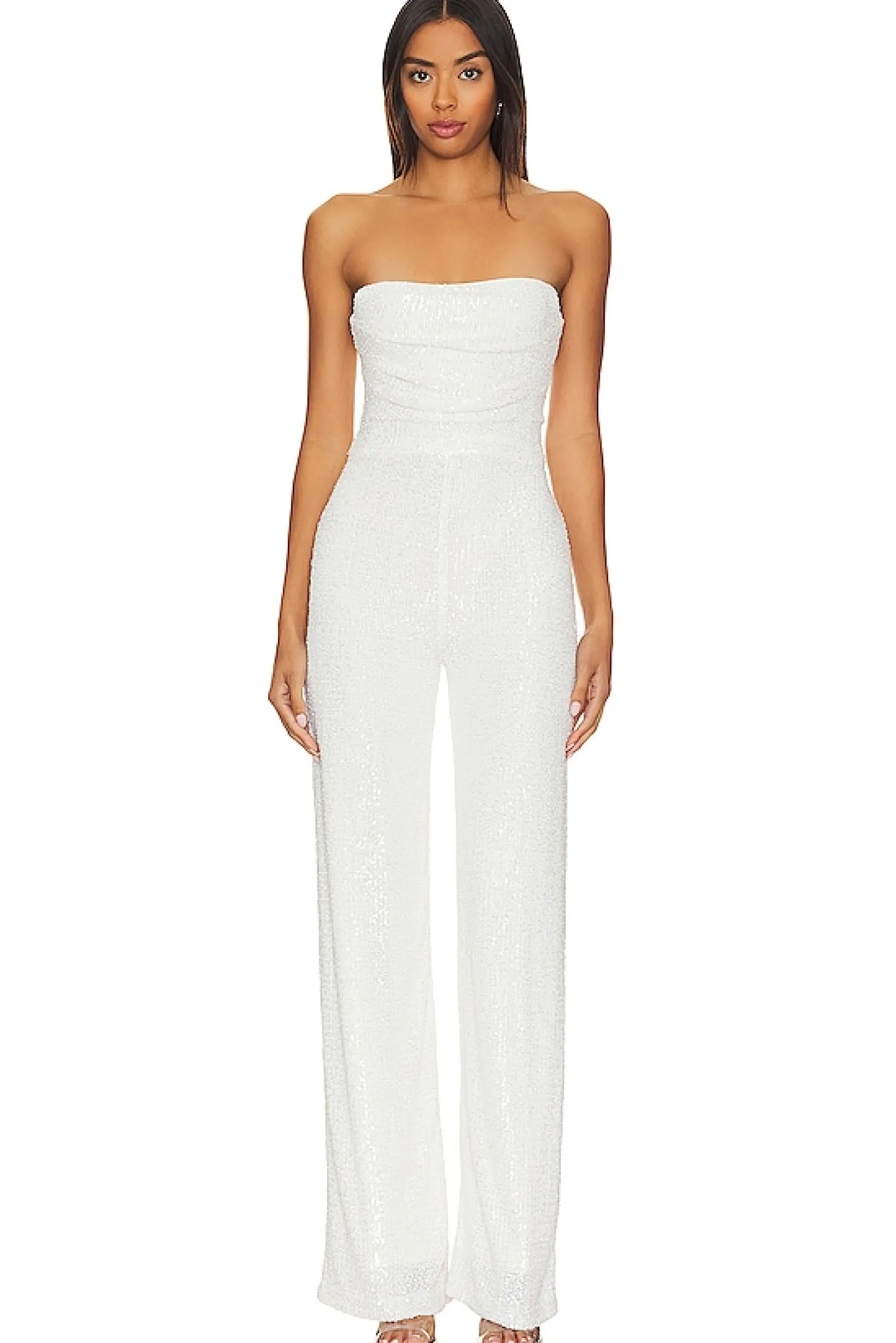 Self: 95% nylon 5% elastane Lining: 95% polyester 5% spandex.Made in Australia.Hand wash.Hidden back zipper closure.Boned sides.Midweight sequin embellished fabric.Neckline to hem measures approx 55" in length 20" at the knee and 20" at the leg opening