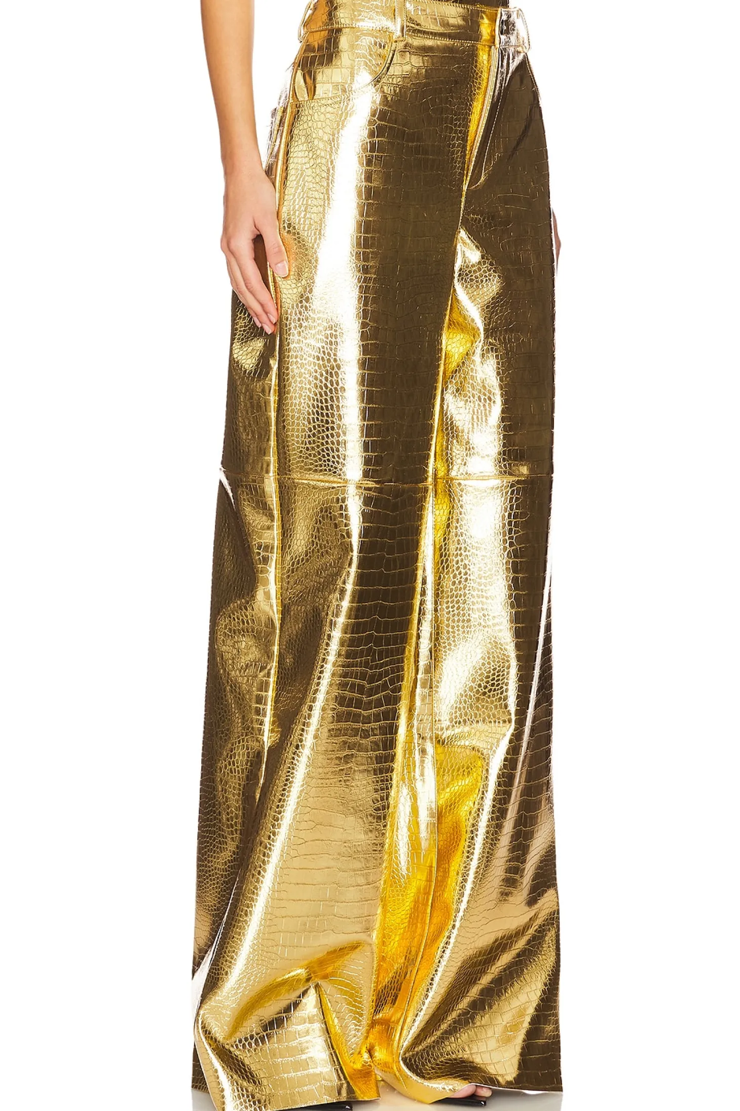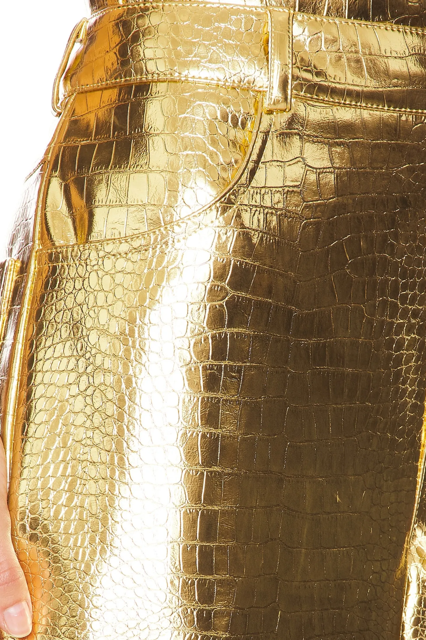 56% recycled polyester 44% polyurethane.Made in Ukraine.Dry clean only.Fly zip with button closure.4-pocket styling.Heavyweight faux leather fabric Item not sold as a set.22" at the knee and 22" at the leg opening