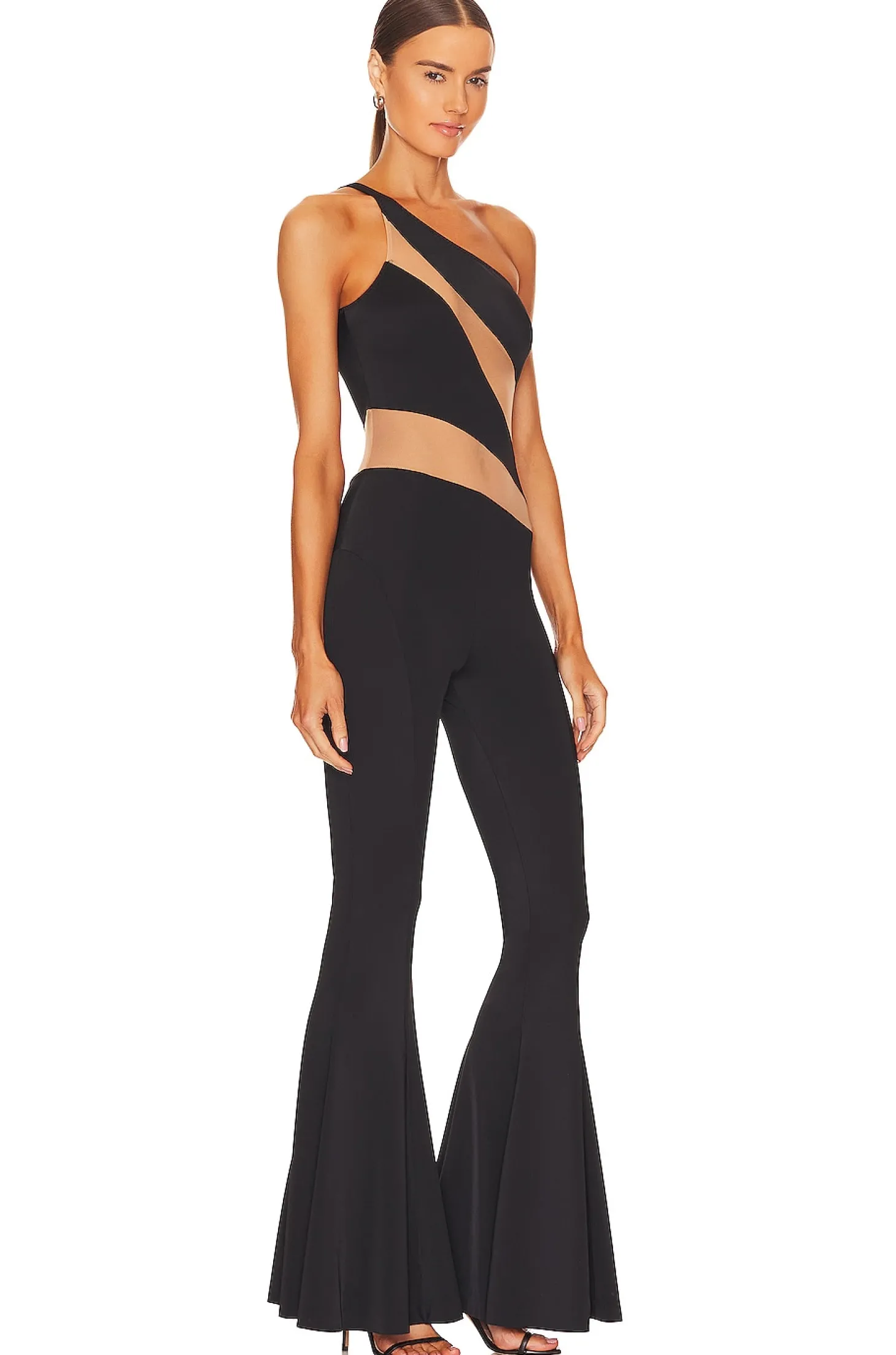 Self: 72% nylon 28% spandex Lining: 82% nylon 18% spandex.Made in China.Machine wash.One shoulder styling.Mesh and jersey fabric.style runs large, size down.14" at the knee breaks to 49" at the leg opening