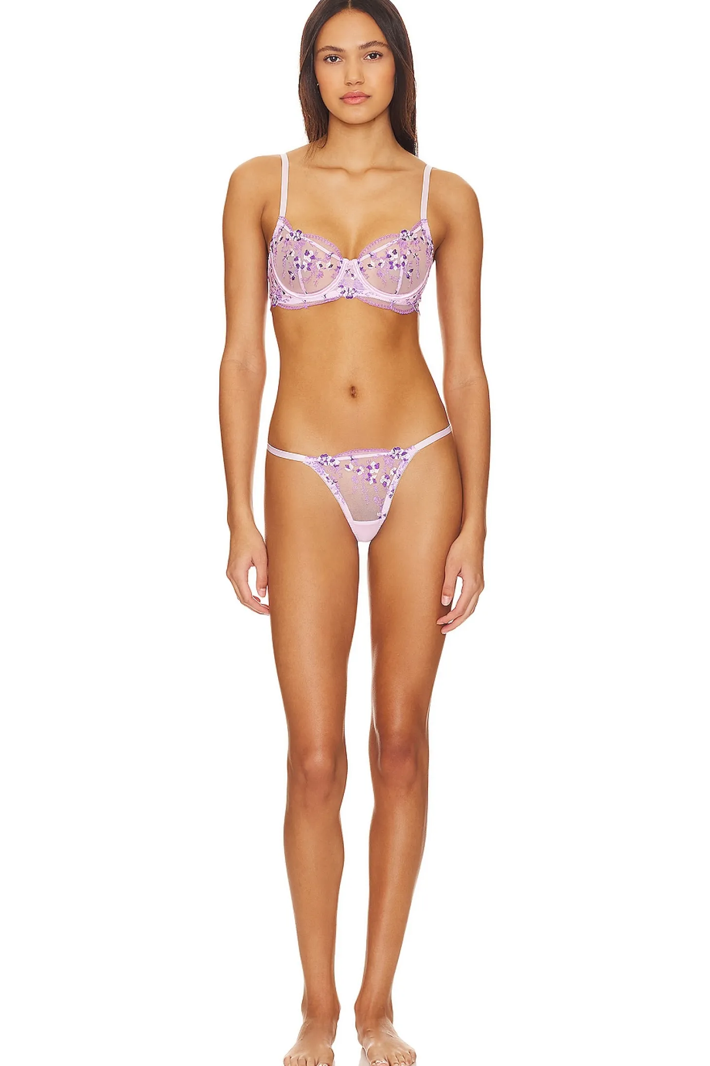 63% polyamide 30% polyester 7% elastane.Made in China.Hand wash.Unpadded underwire bust.Back hook and eye closure.Adjustable shoulder straps.Mesh fabric with floral stitching throughout.Item not sold as a set