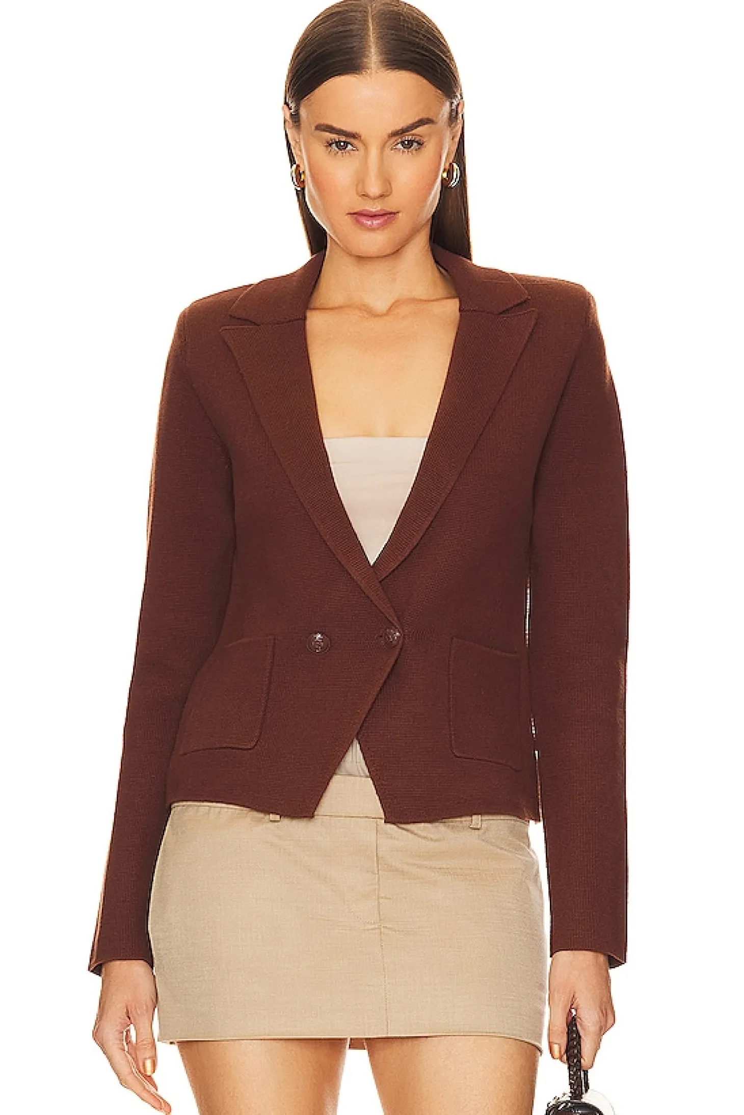 50% cotton 40% acrylic 10% nylon.Made in China.Hand wash.Front button closure.Padded shoulders.Front slip pockets.Midweight knit fabric