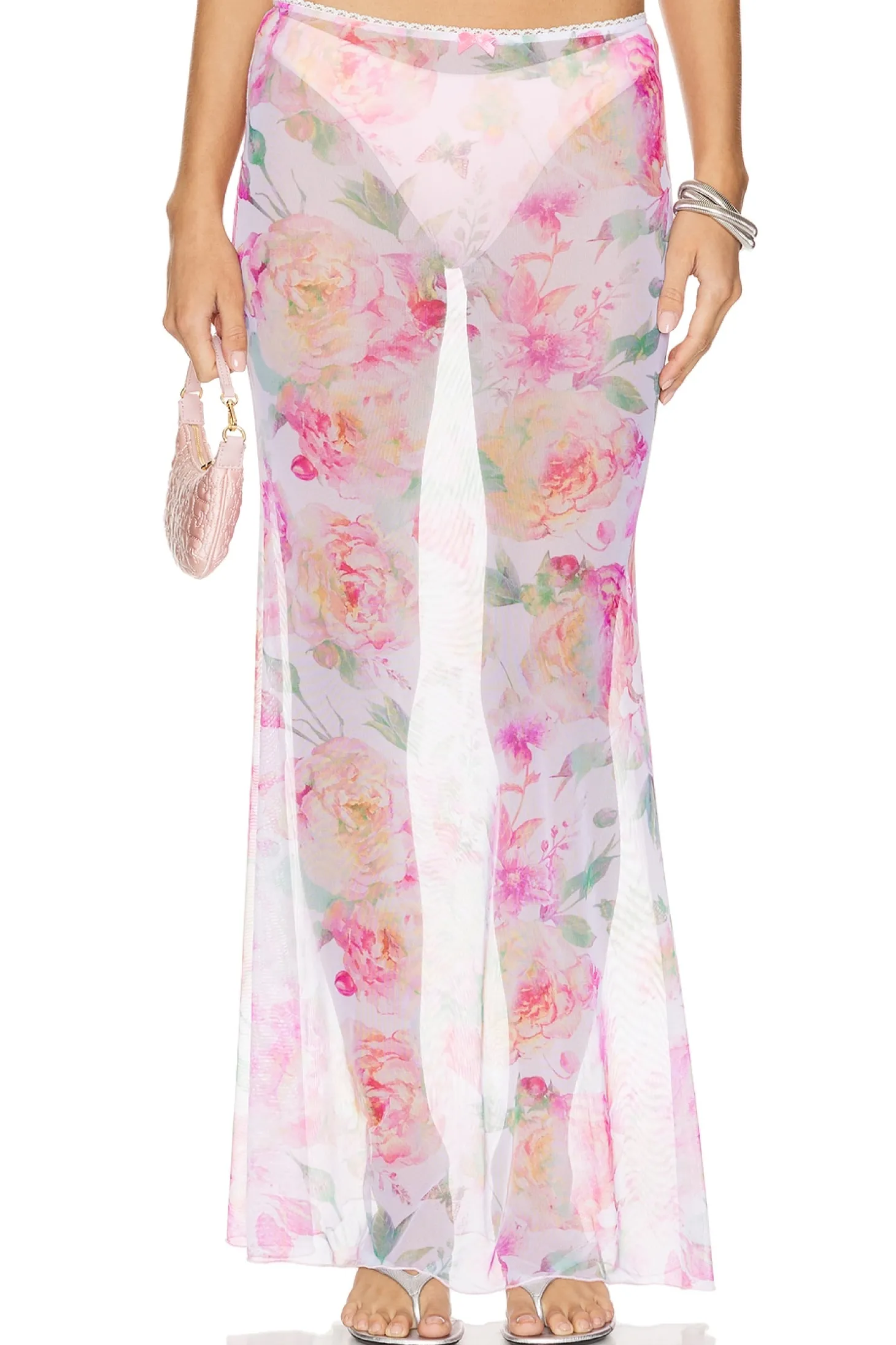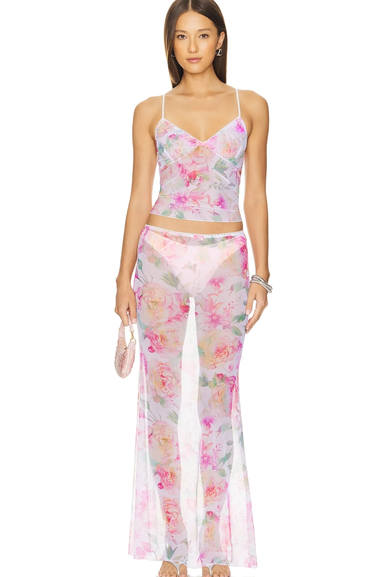 95% nylon 5% lycra.Made in Israel.Machine wash.Unlined.Garment is intentionally sheer, undergarments will show through. Please note undergarment not included.Lace trim and Bananhot pendant.Item not sold as a set.Skirt measures approx 42" in length