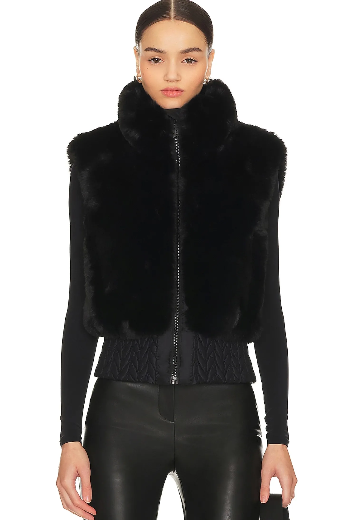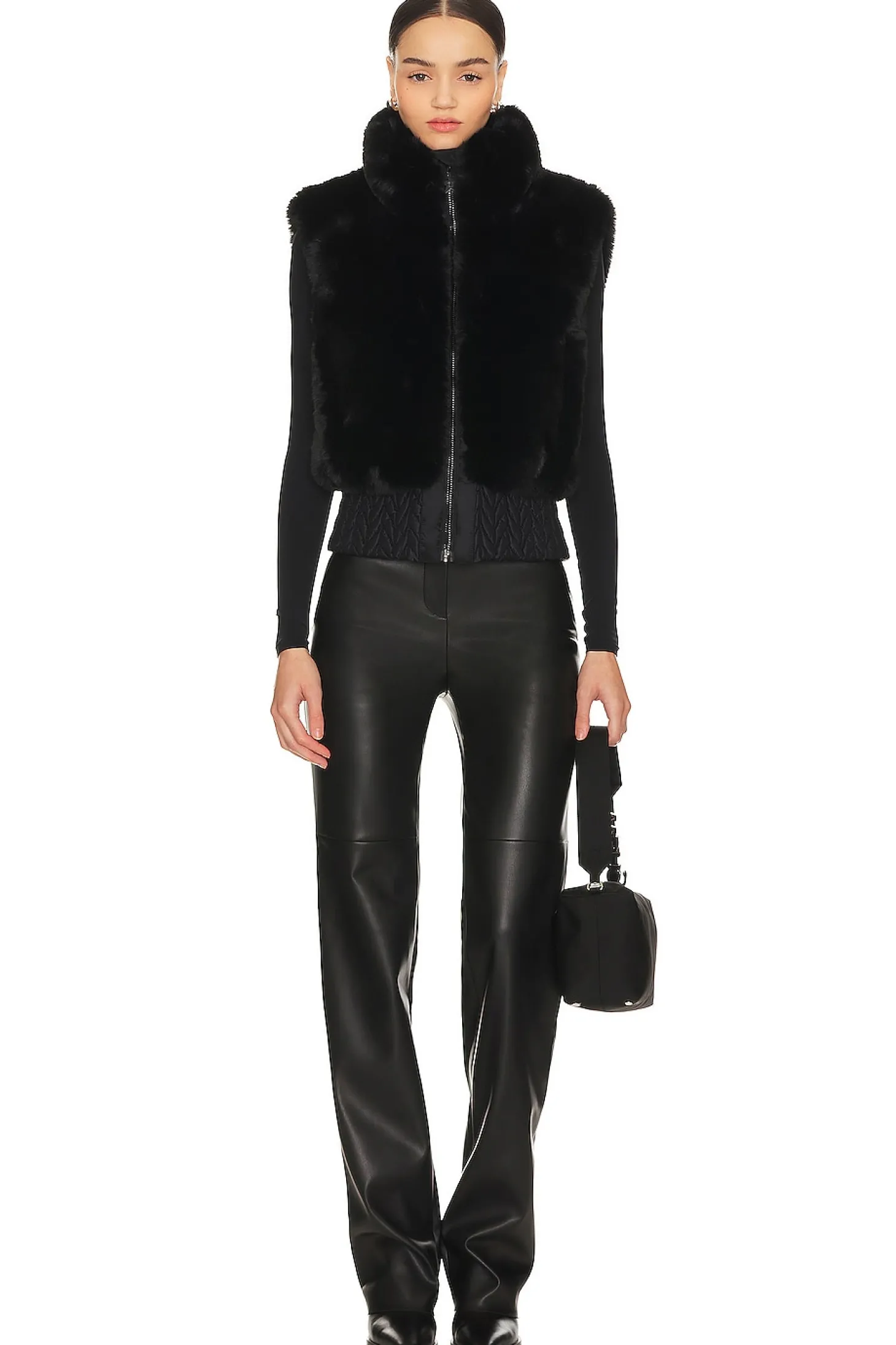 Self 1& Fill: 100% polyester Self 2: 100% georecycled polyester Lining 58% polyester 42% recycled polyester.Made in China.Machine wash.Front zipper closure.Side seam pockets.Midweight faux fur and ripstop fabric