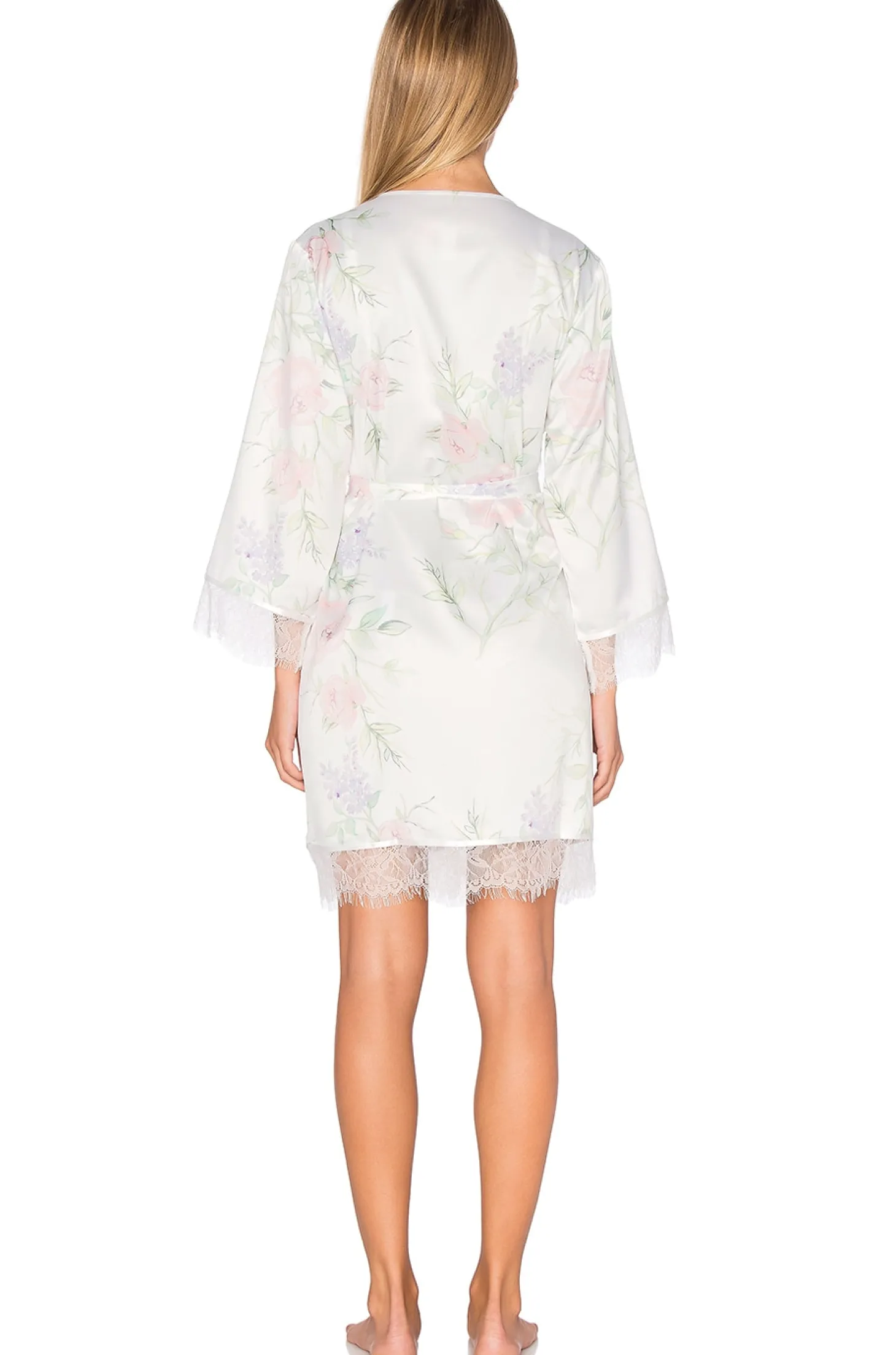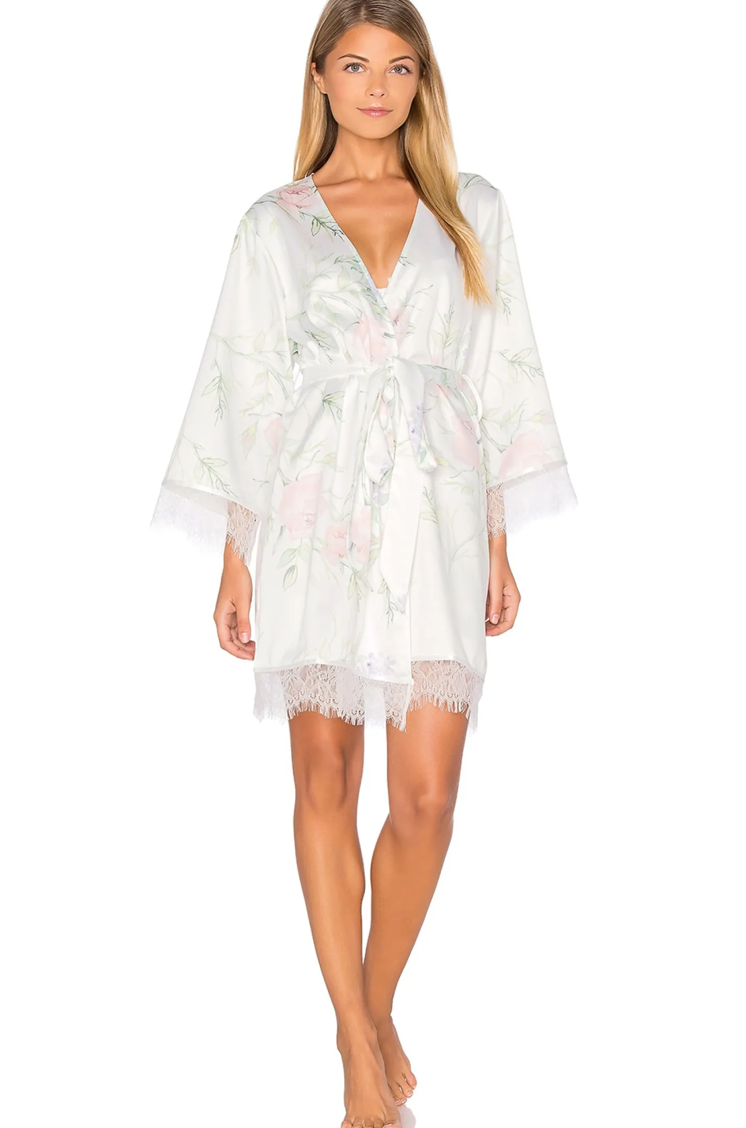 100% poly.Open front.Belted waist tie.Contrast lace trim