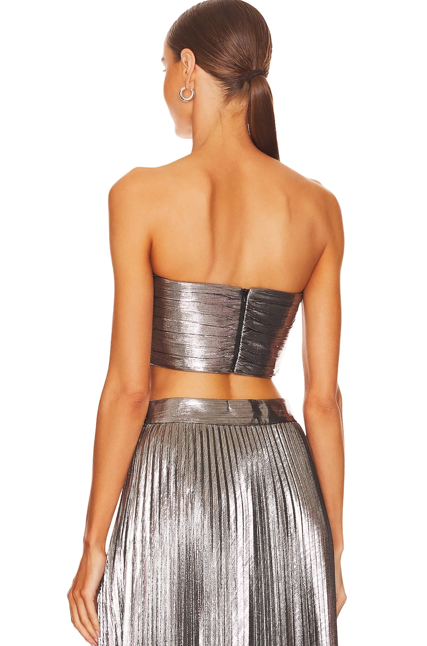 95% polyester 5% spandex.Made in China.Hand wash.Exposed back zipper closure.Boned bodice.Pleated metallic fabric.Item not sold as a set.The Sophia Top will quickly become the silver lining of your next night out. Zipped along the back, this strapless top wraps for a no slip sweetheart.