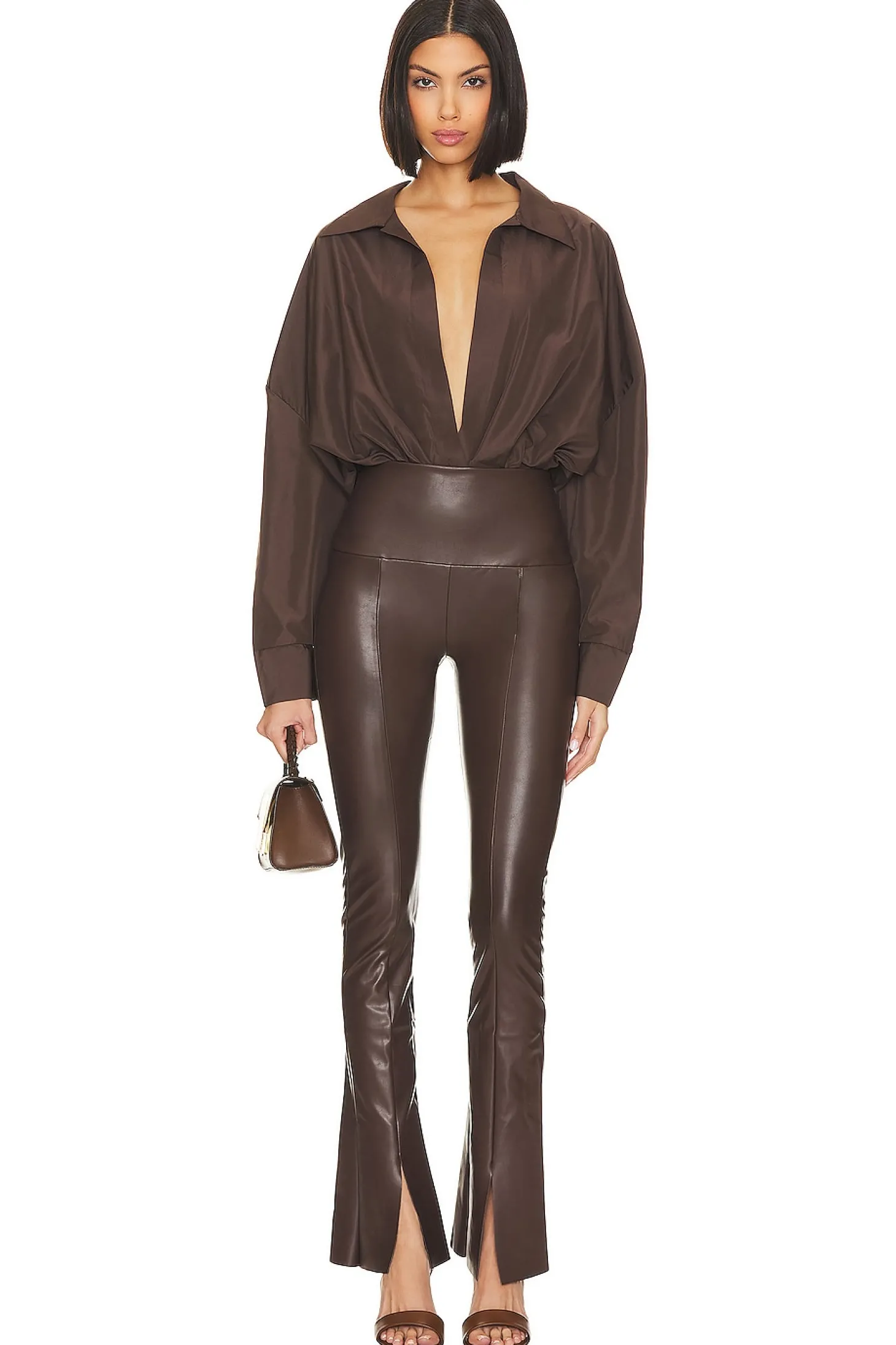 Turn heads in style with Norma Kamali's Chocolate Spat Legging. These high-waisted, faux leather leggings feature split cuffs and a curve-hugging fit, perfect for a chic and edgy look..Self: 100% polyurethane Back: 90% polyester 10% spandex.Made in China.Machine wash.Pull-on styling with wide stretch waistband.Smooth faux leather fabric with split cuffs.style runs large, size down.9" at the knee breaks to 11" at the leg opening