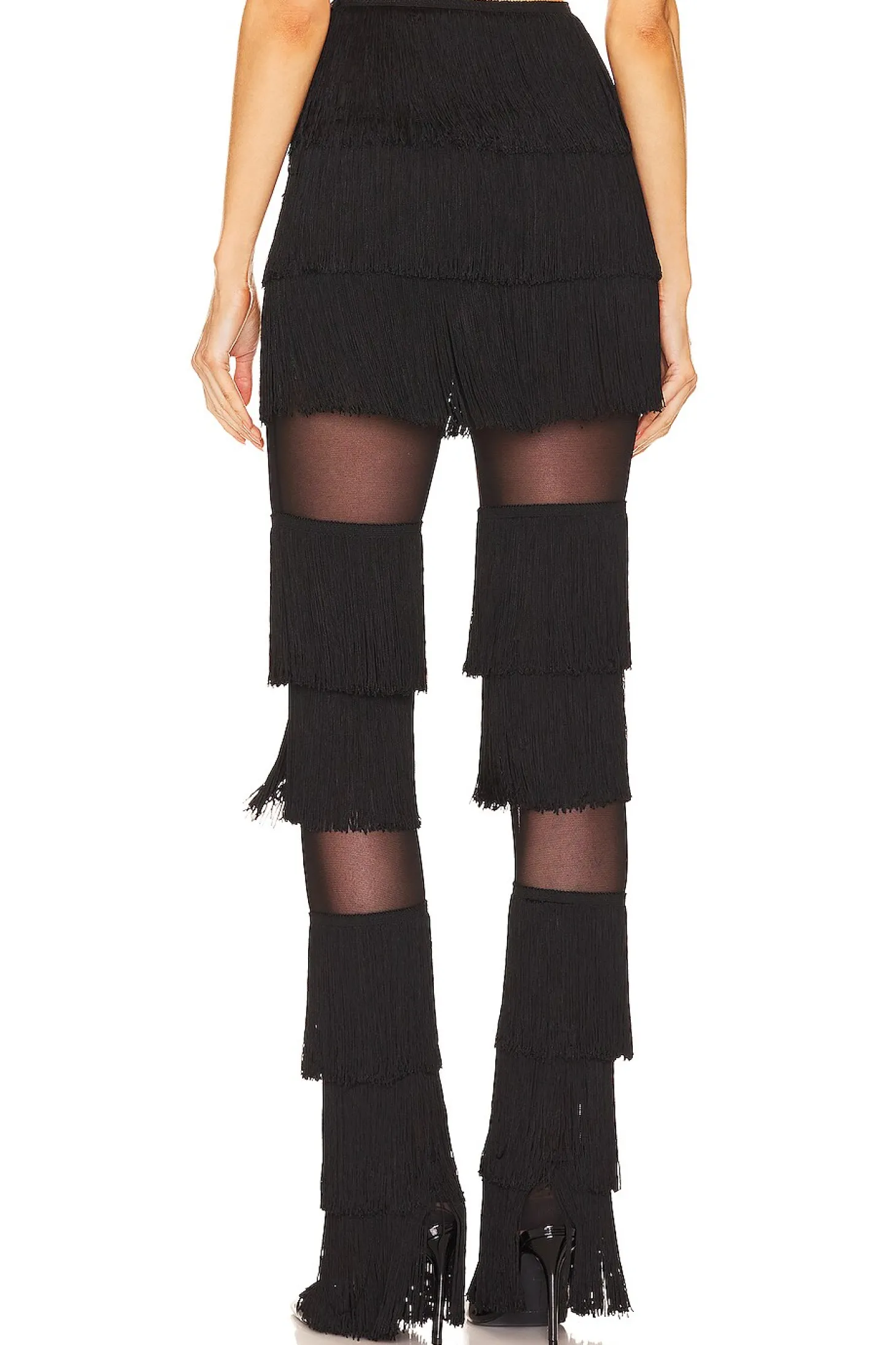 Perfect for a night out on the town, the Norma Kamali Spliced Boot Pant With Fringe in classic Black are the ones you need. Crafted from mesh fabric, these pants feature striking fringe overlays that add a touch of drama and movement. The bootcut silhouette offers a flattering fit, while the mesh panels lend a hint of allure to your ensemble..Self: 82% nylon 18% spandex Fringe: 100% polyester.Made in USA.Dry clean only.Elastic waistband.Mesh fabric panels with fringe design overlay.Item not sold as a set.16" at the knee narrows to 12" at the leg opening.style runs large, size down