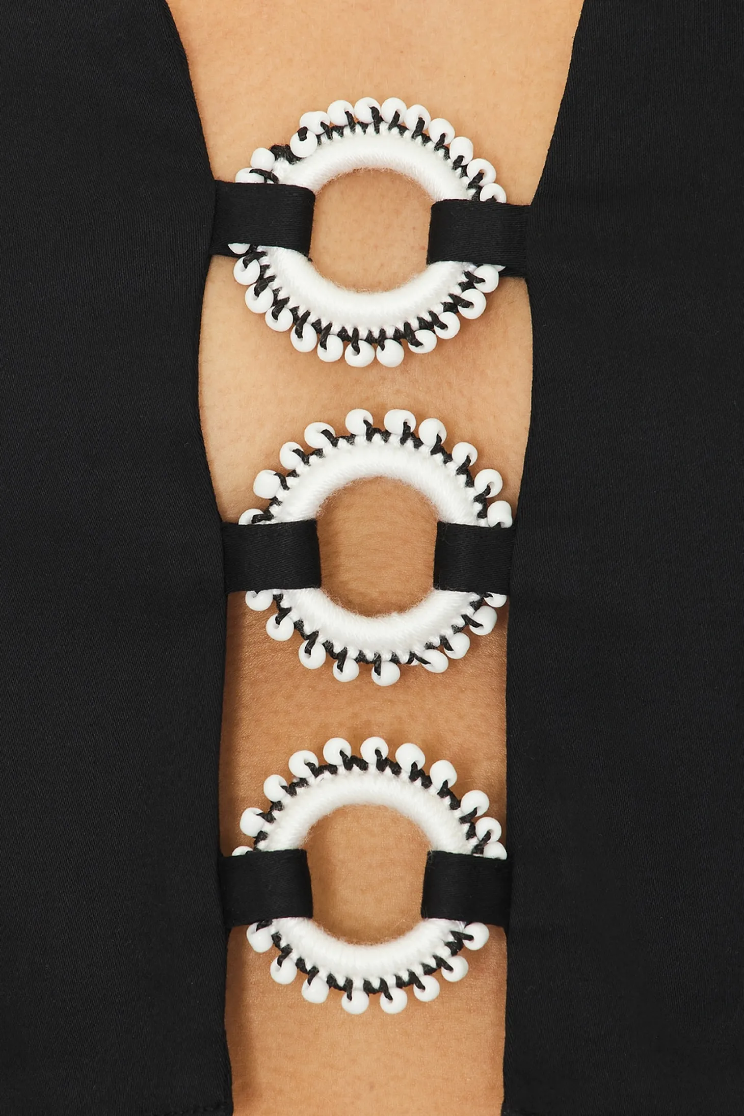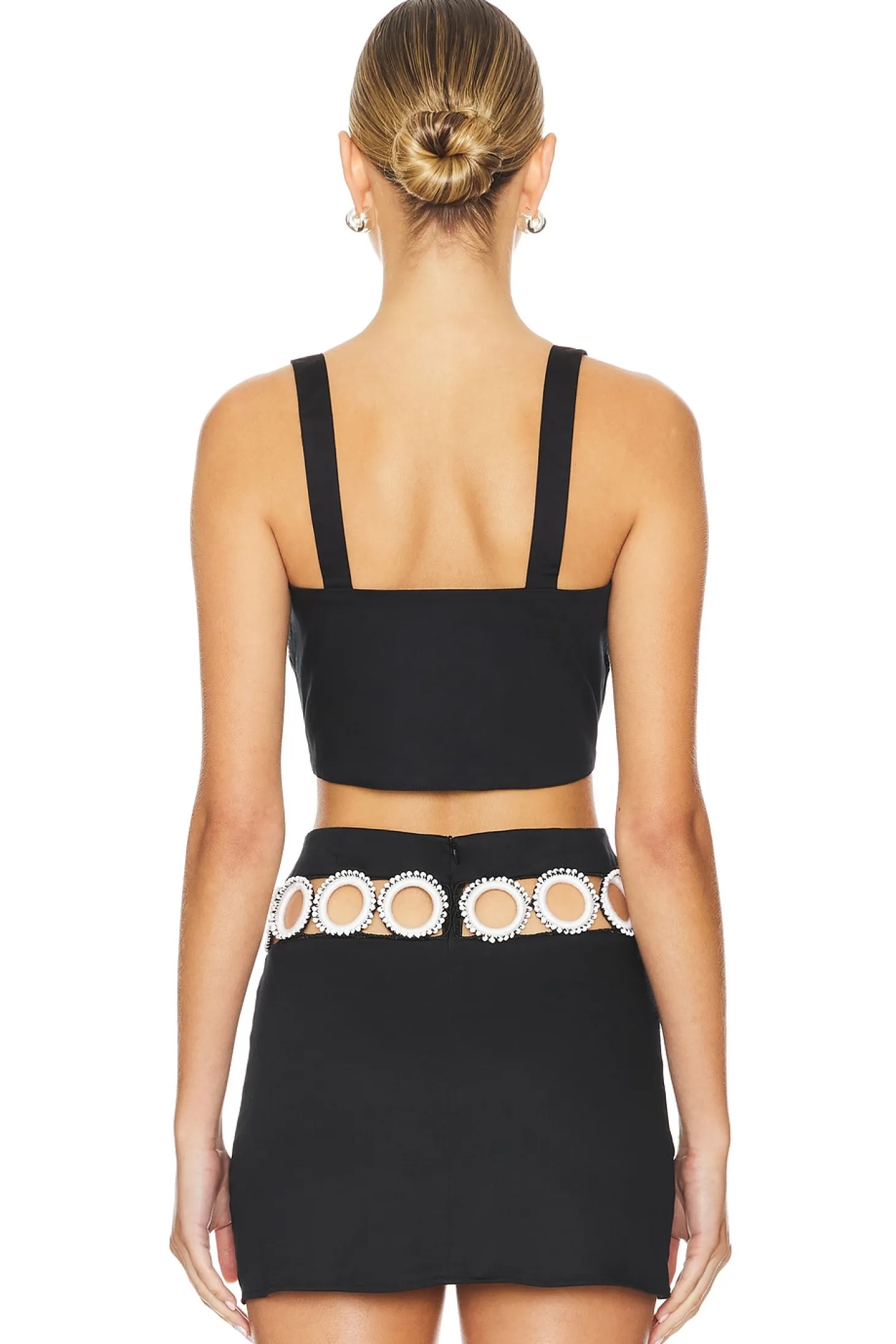 98% cotton 2% elastane.Made in Turkey.Hand wash.Hidden side zipper closure.Front O-ring accents with bead embellishments.Lightweight twill fabric.Item not sold as set