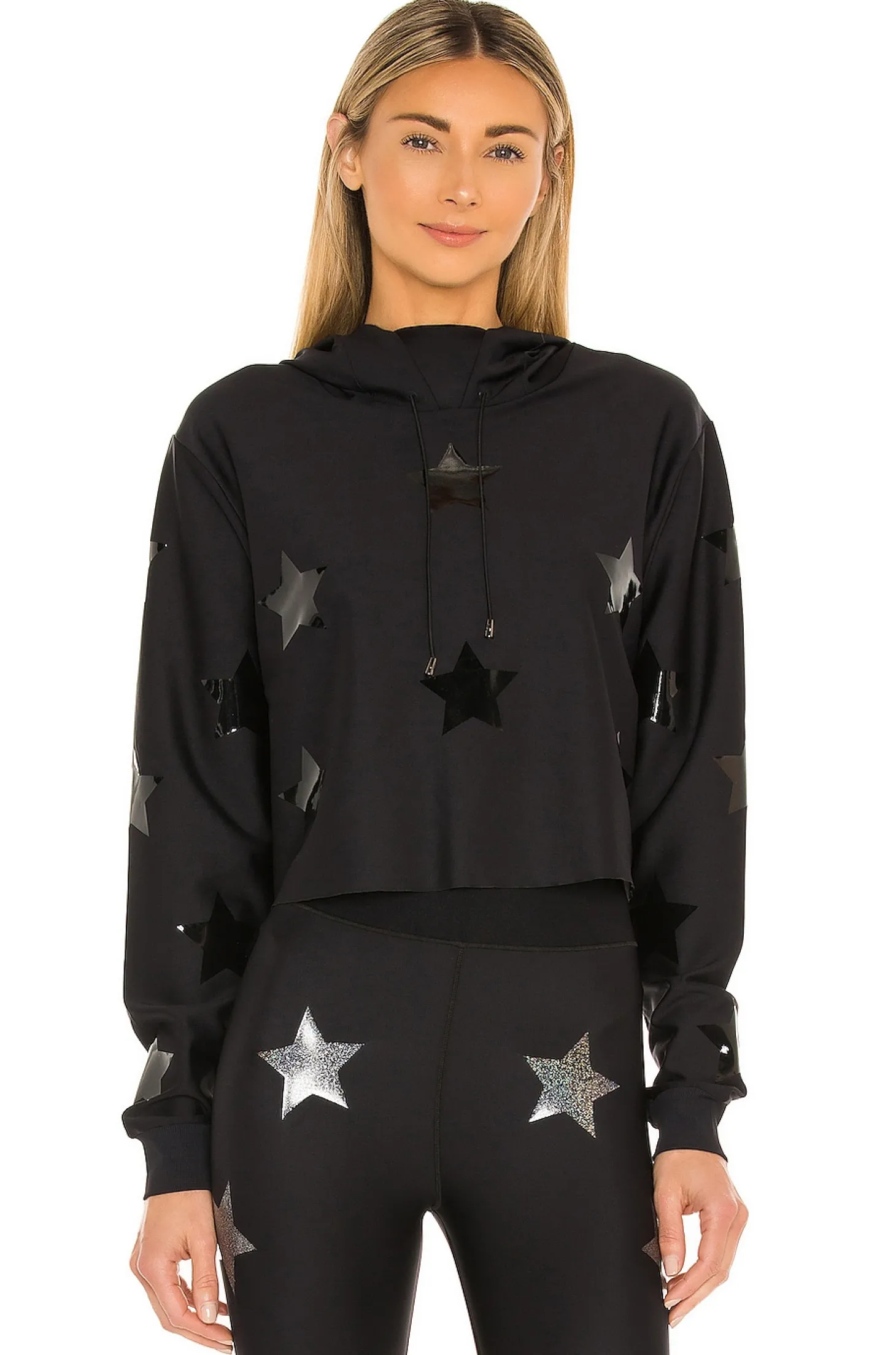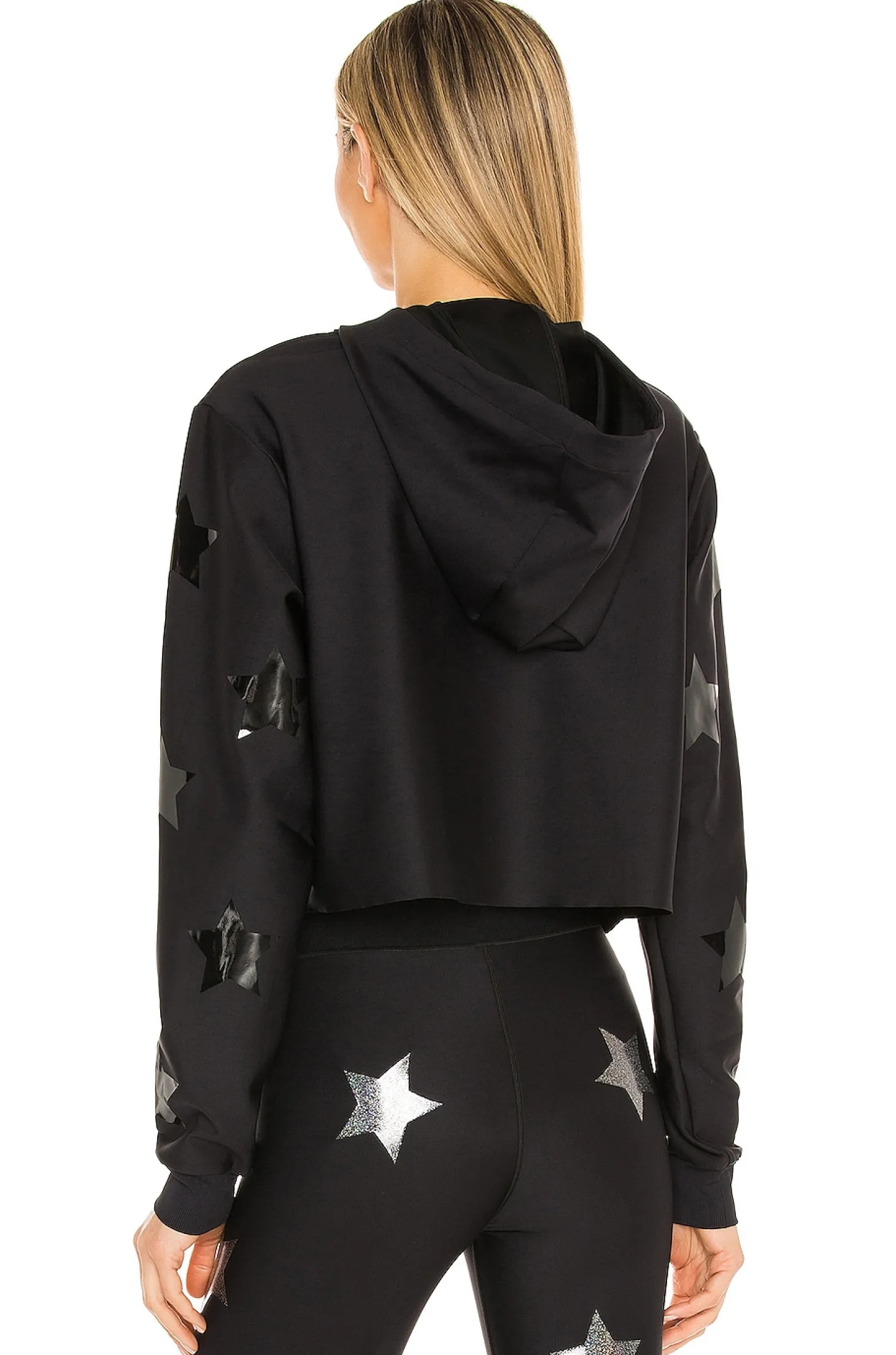 84% nylon 16% lycra spandex.Made in USA.Machine wash.Attached drawstring hood.Stretch-fit fabric with ribbed cuffs.Raw-cut hem.Shiny black star appliques.Item not sold as set
