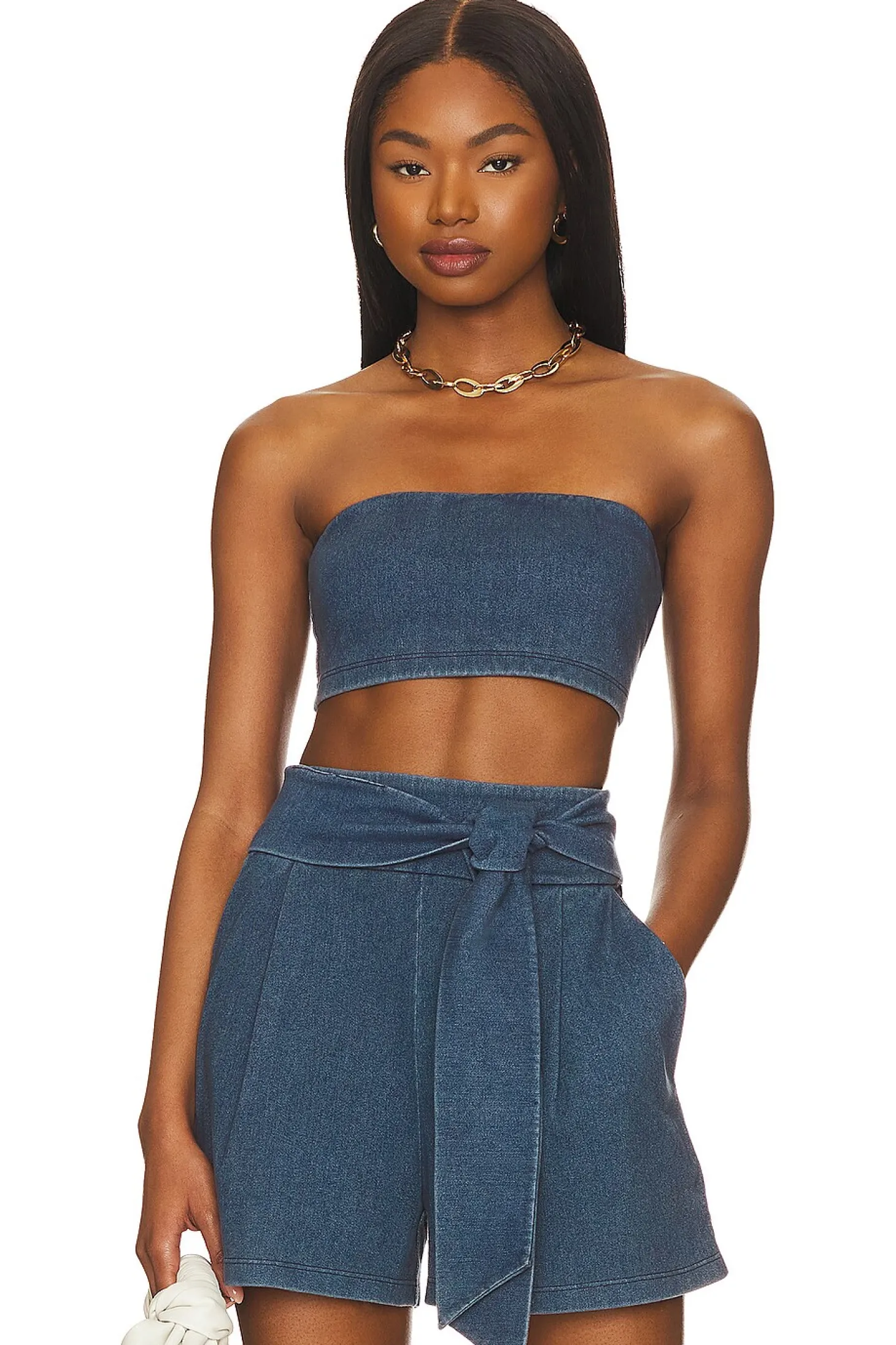 59% cotton 29% polyester 12% elastane.Made in Vietnam.Machine wash.Lightweight denim fabric.Item not sold as a set.This micro tube top features a flattering strapless design for a chic look. The lightweight denim fabric offers comfort and style all day long.