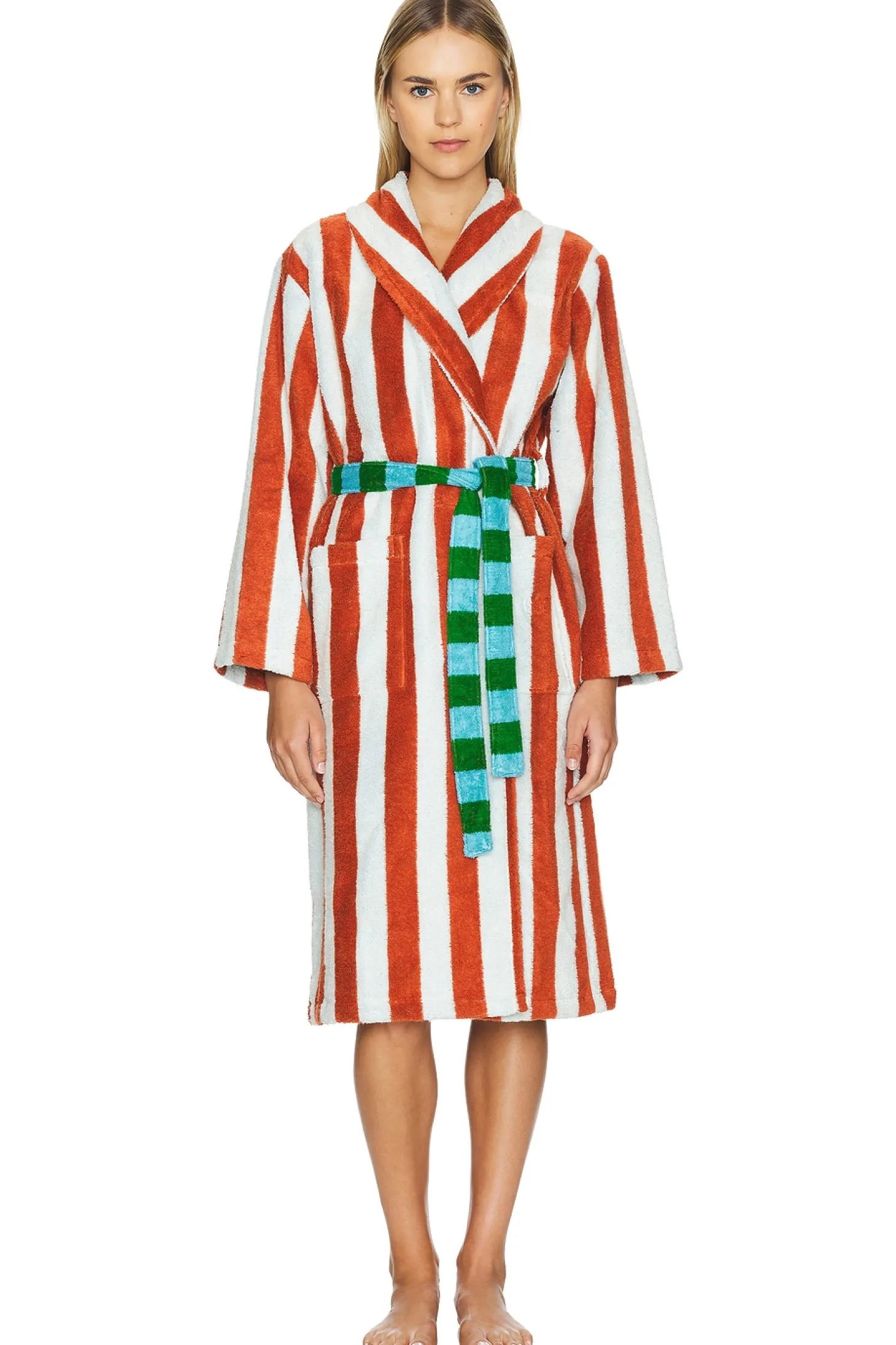 Cotton terry bathrobe with shawl collar, patch pockets, and tie in brown and white contrasting blue and green on the inside..95% cotton 5% polyamide.Made in Portugal.Machine wash