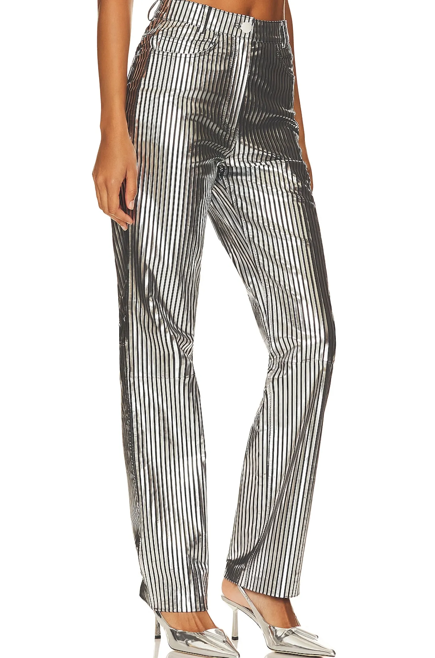 Leather blend.Imported.Dry clean recommended.Zip fly with button closure.5-pocket design.Metallic leather fabric with stripe design.14" at the knee and 14" at the leg opening