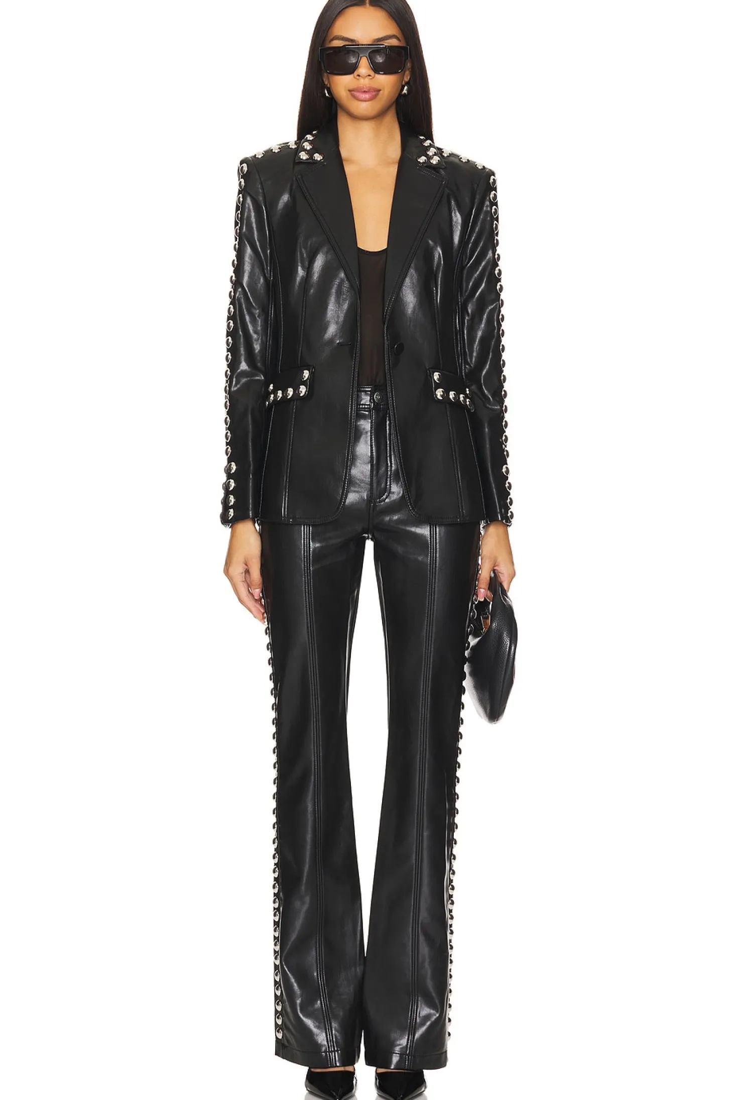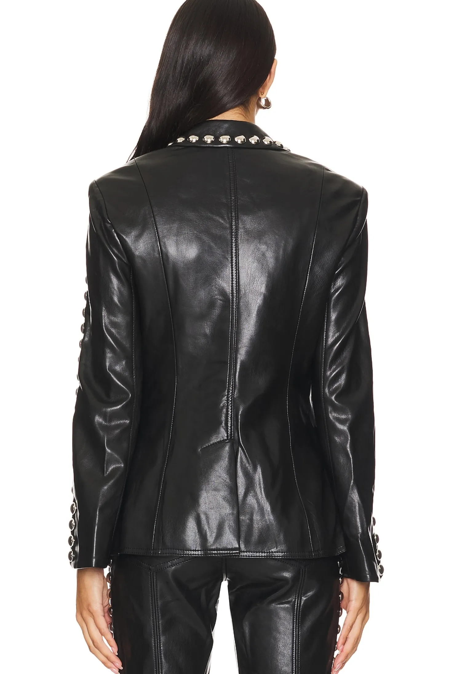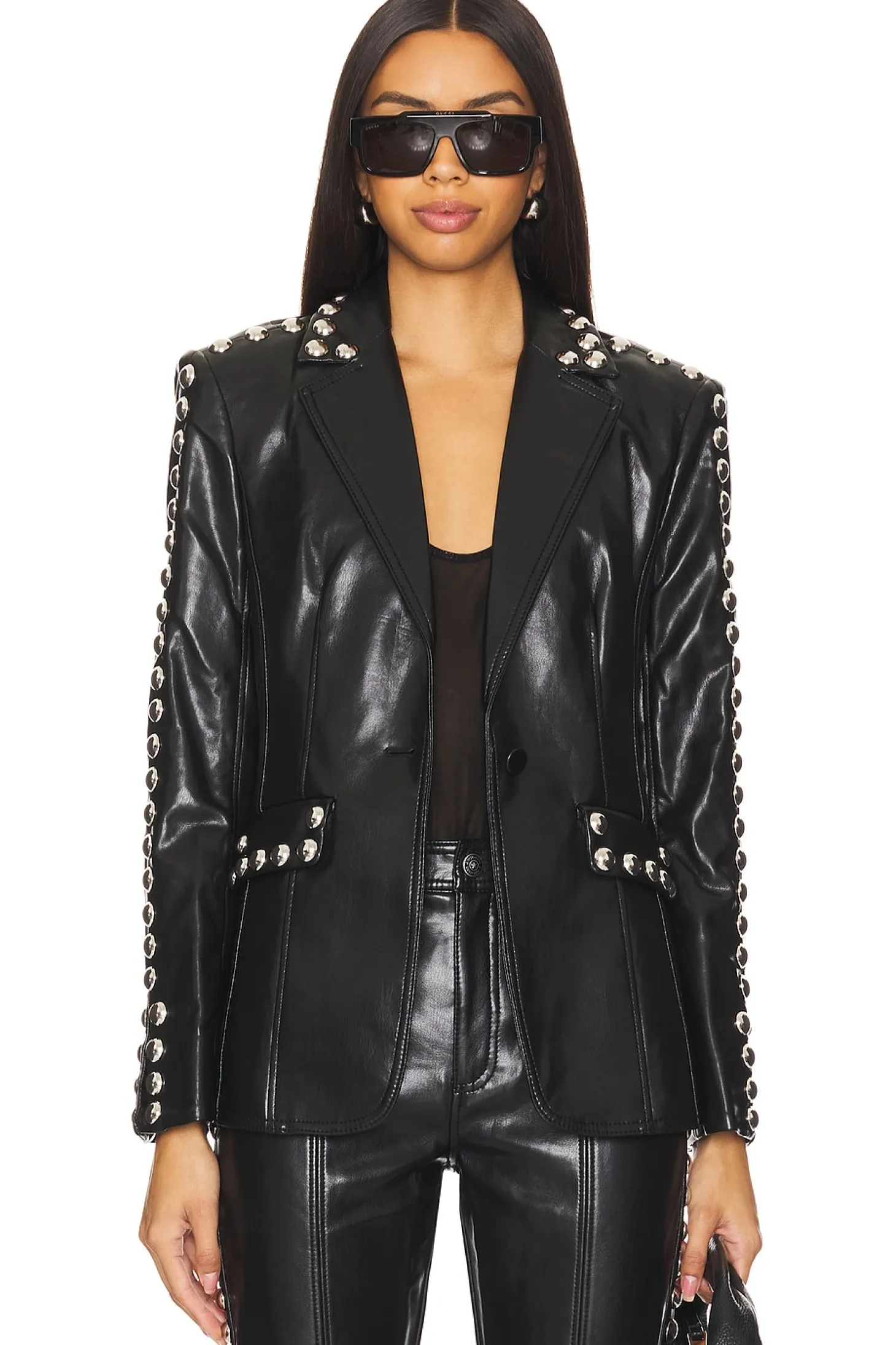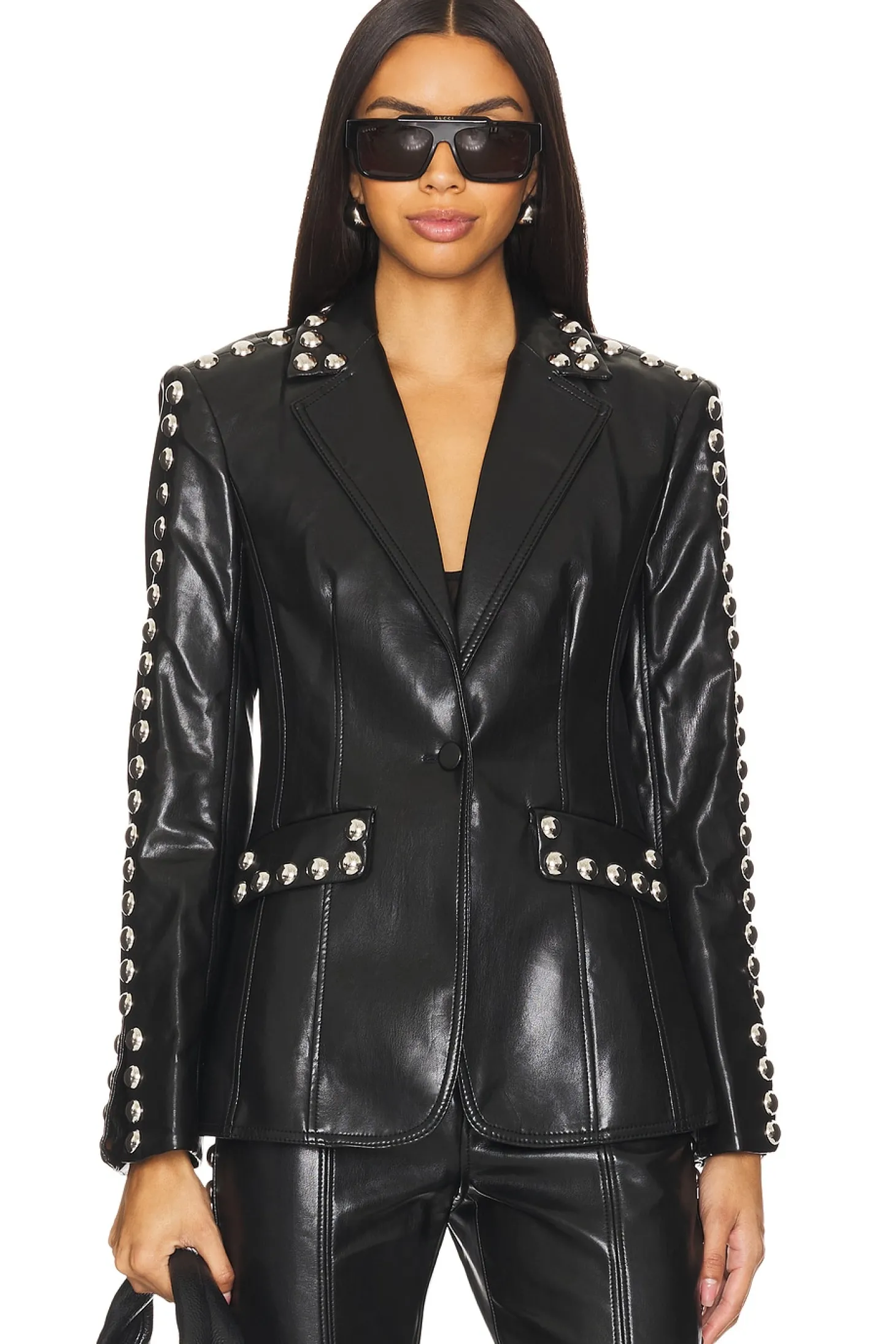 Self: 100% viscose Lining: 100% polyester.Made in China.Dry clean only.Front button closure.Front flap pockets and back vent.Lightweight faux leather fabric with stud detailing throughout