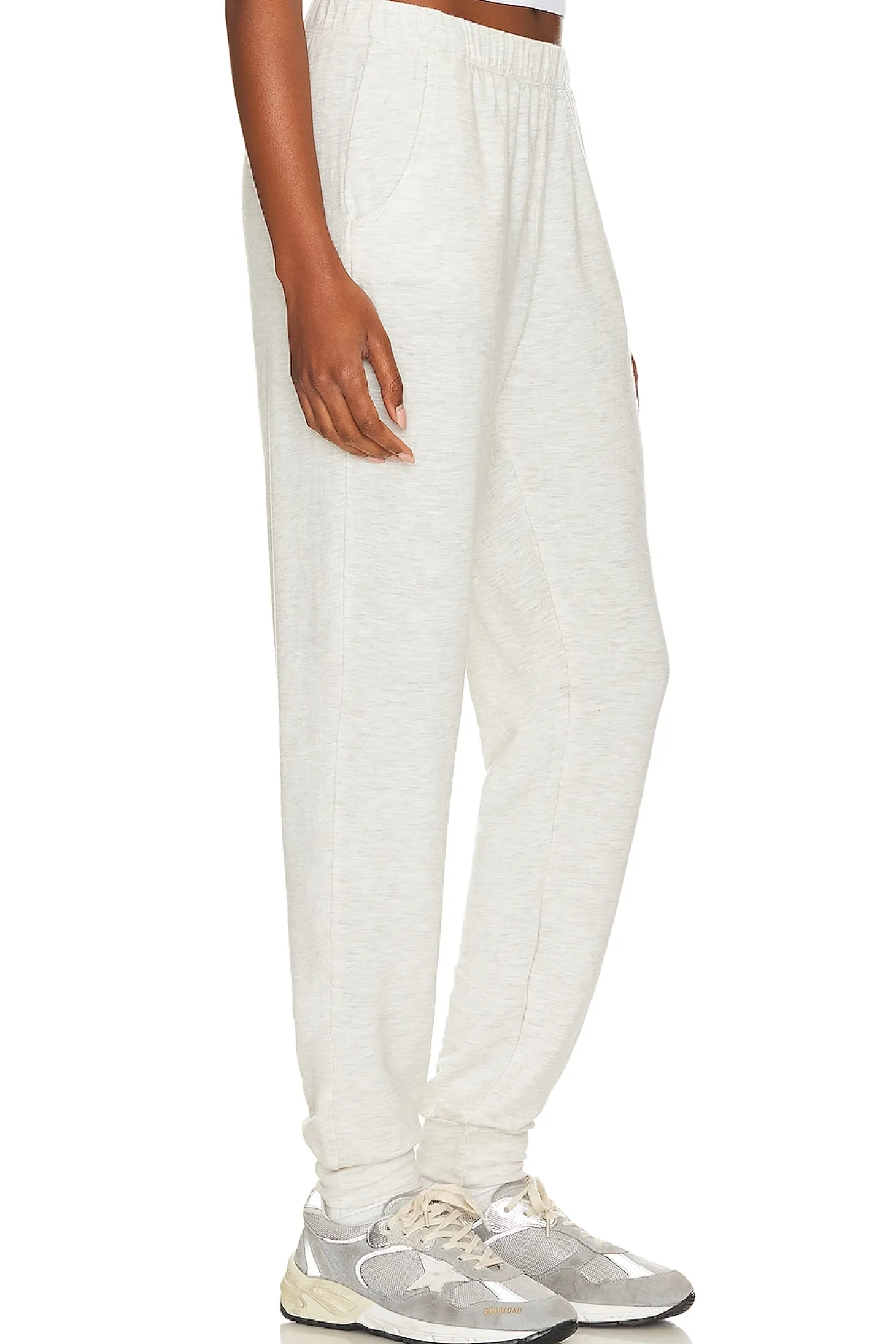 70% rayon 27% cotton 3% spandex.Made in USA.Machine wash.Elastic waistband.Side slant pockets.Elastic cuffs.Item not sold as a set.15" at the knee narrows to 9" at the leg opening