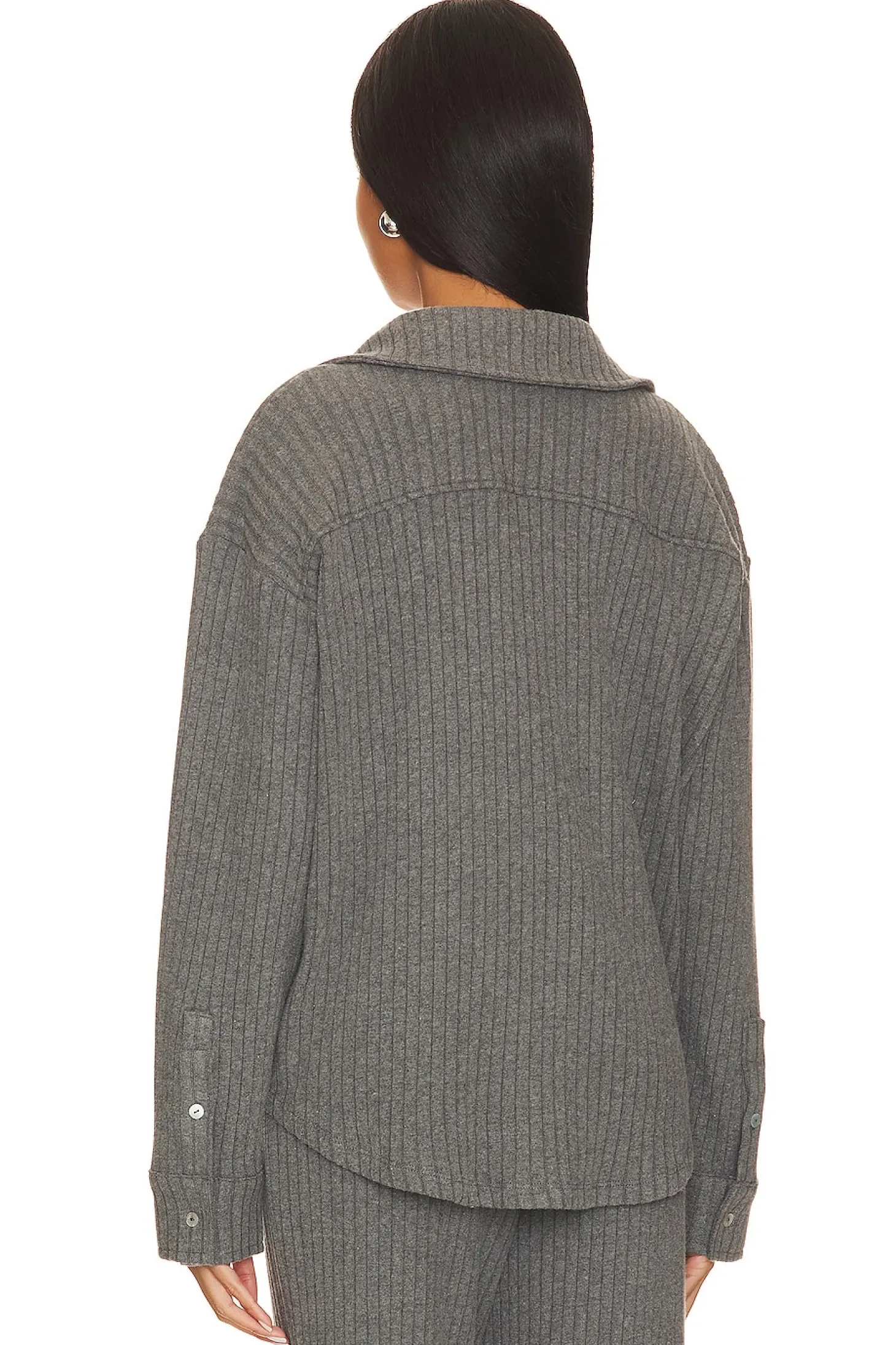 47% tencel 47% organic cotton 6% spandex.Made in USA.Hand wash.Front button closure.Breast slip pocket.Buttoned cuffs.Soft ribbed knit fabric