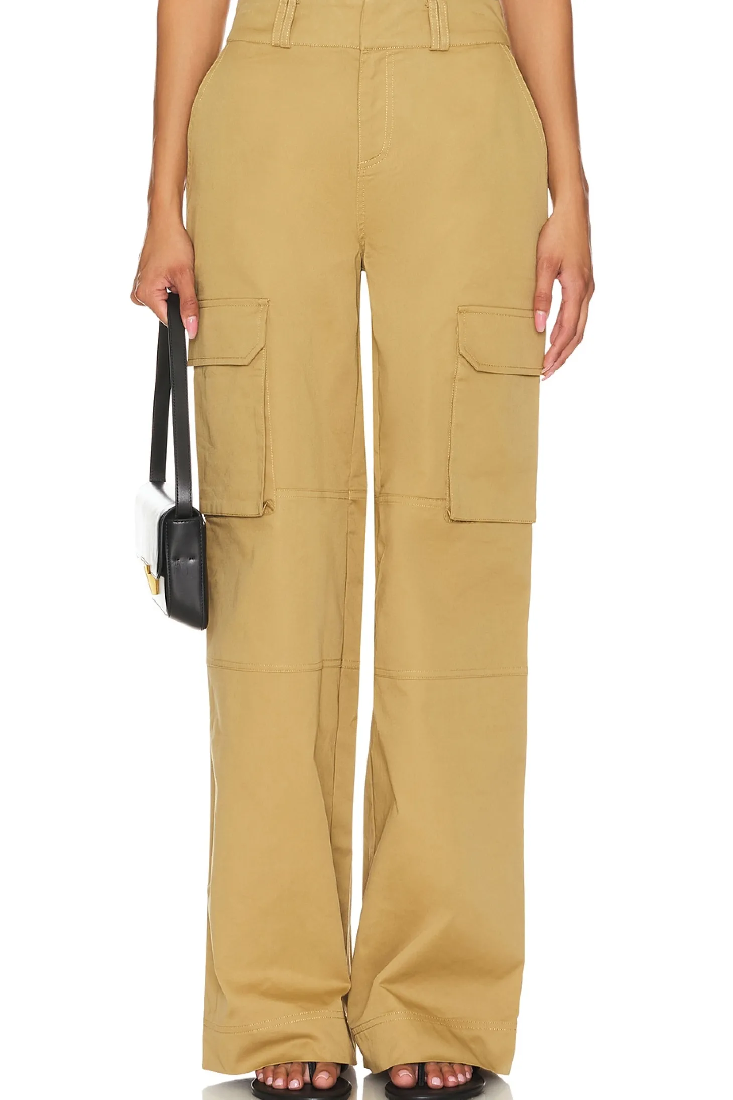 63% cotton 37% polyester.Made in China.Dry clean only.Zip fly with hook and bar closure.Side seam pockets.Cargo pockets.Midweight twill fabric.22" at the knee and 22" at the leg opening