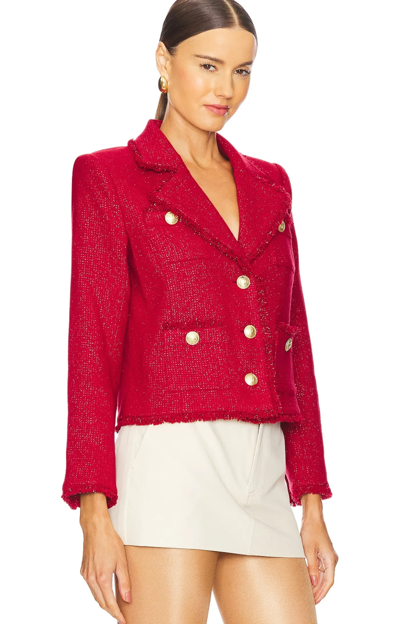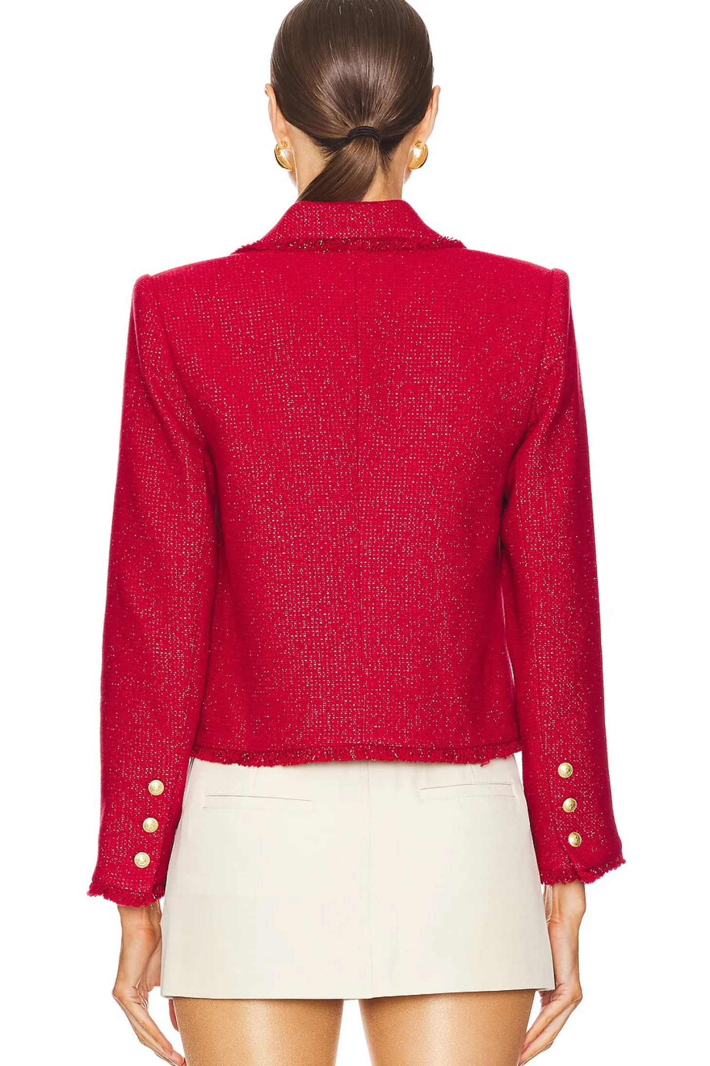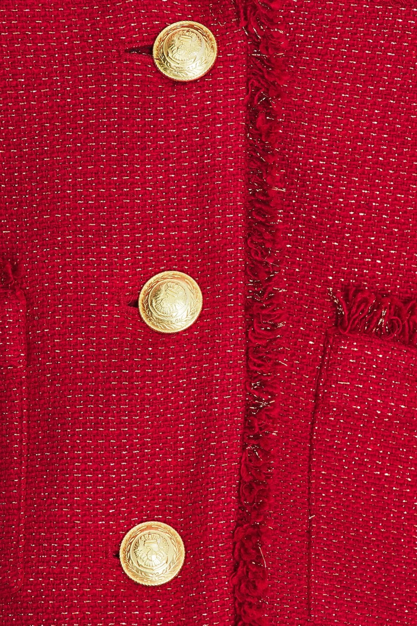 80% cotton 18% polyester 1% metallic fiber 1% nylon.Made in China.Dry clean only.Front button closure.Buttoned cuffs.4-pocket design.Midweight tweed fabric with padded shoulders and metallic threading