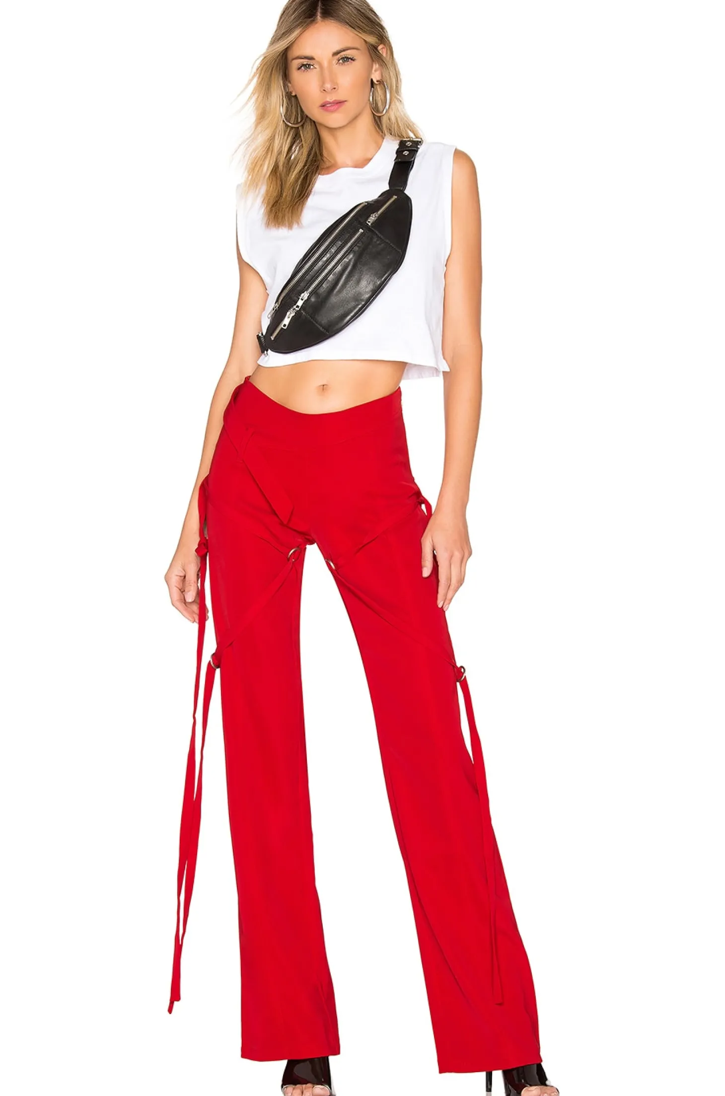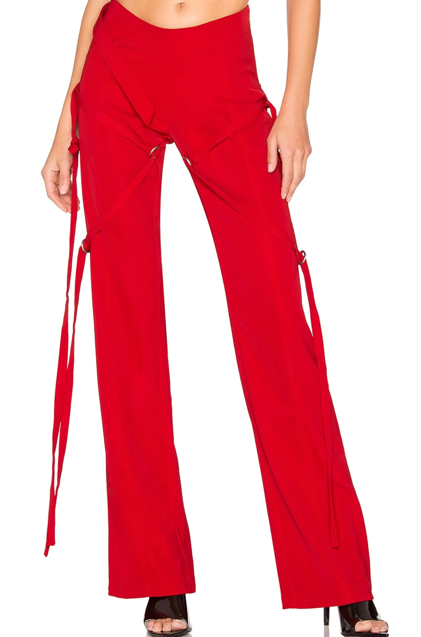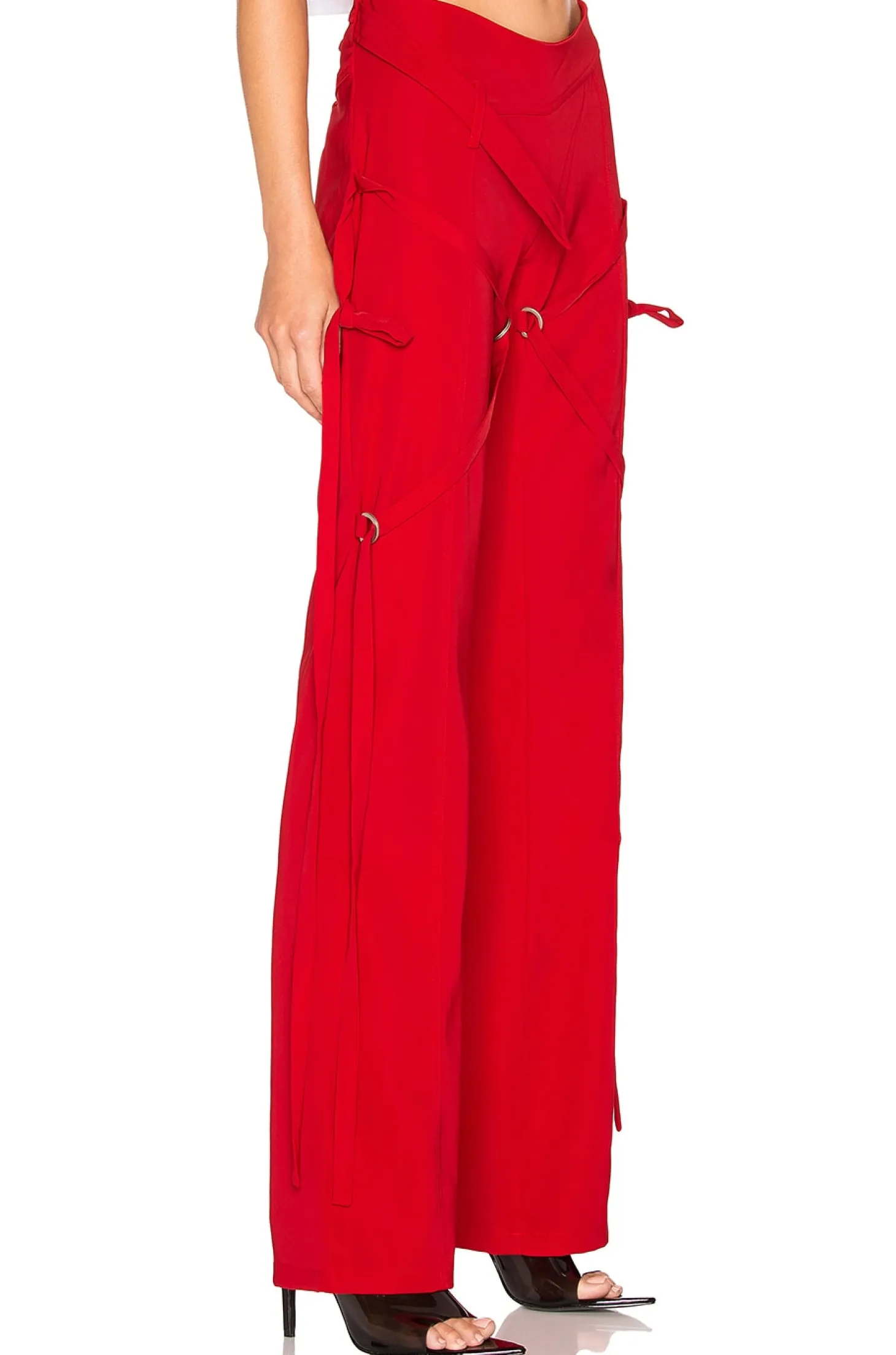 Main: 100% polyester .Made in China.Multi strap detail with knot and D-ring accents.Exposed side zipper closure.17" at the knee breaks to 18" at the leg opening.Imported