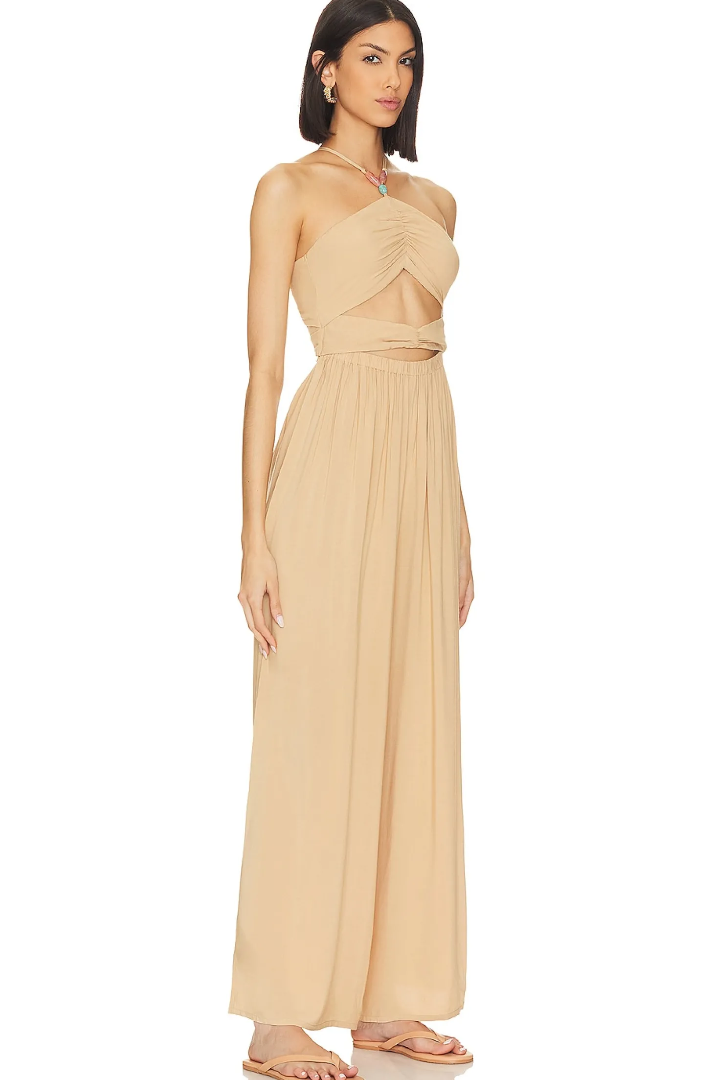 100% rayon.Made in China.Hand wash.Pull-on styling with back tie closure with beaded ends.Elastic waistband.Underbust and bodice cut-outs.Voile fabric with beaded embellishments at neckline