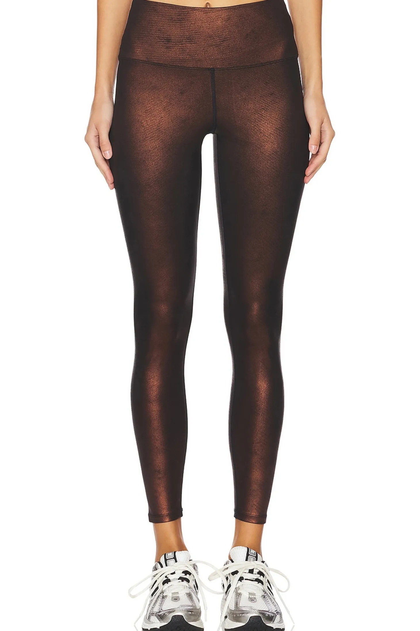 Activewear textile.Imported.Hand wash recommended.High-waisted fit design.Coated metallic bronze fabric.Item not sold as a set