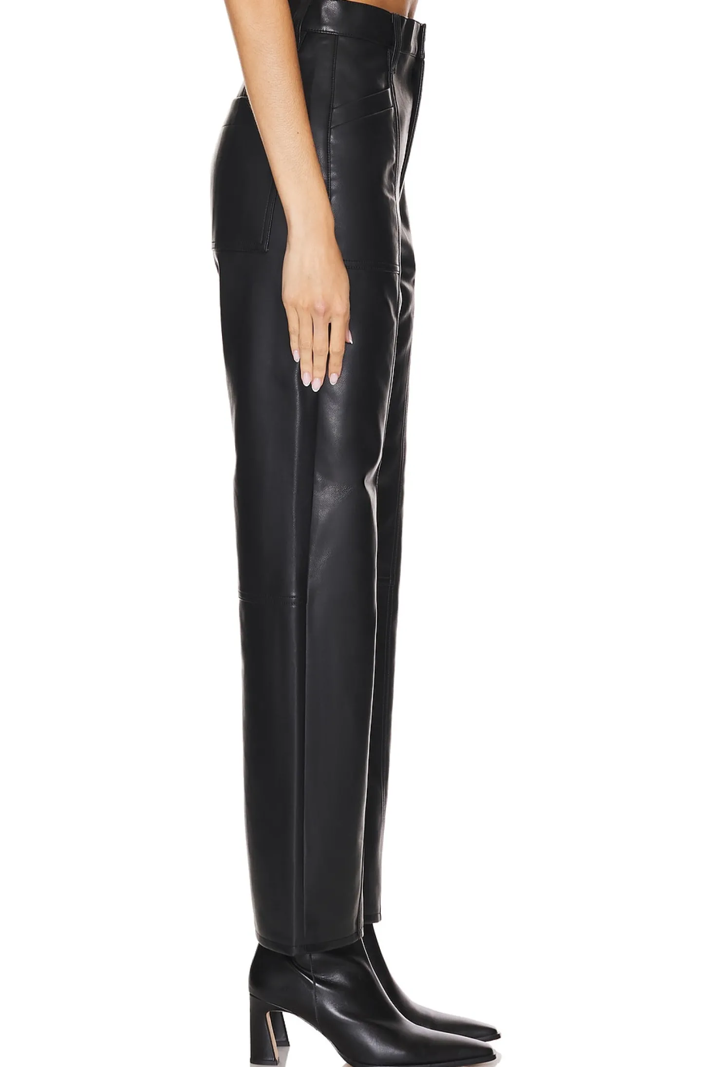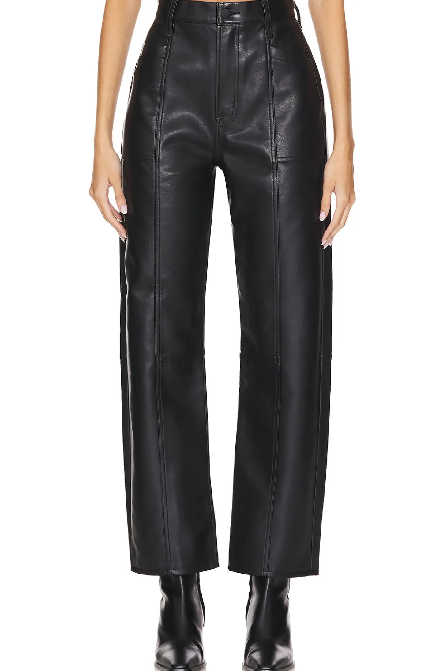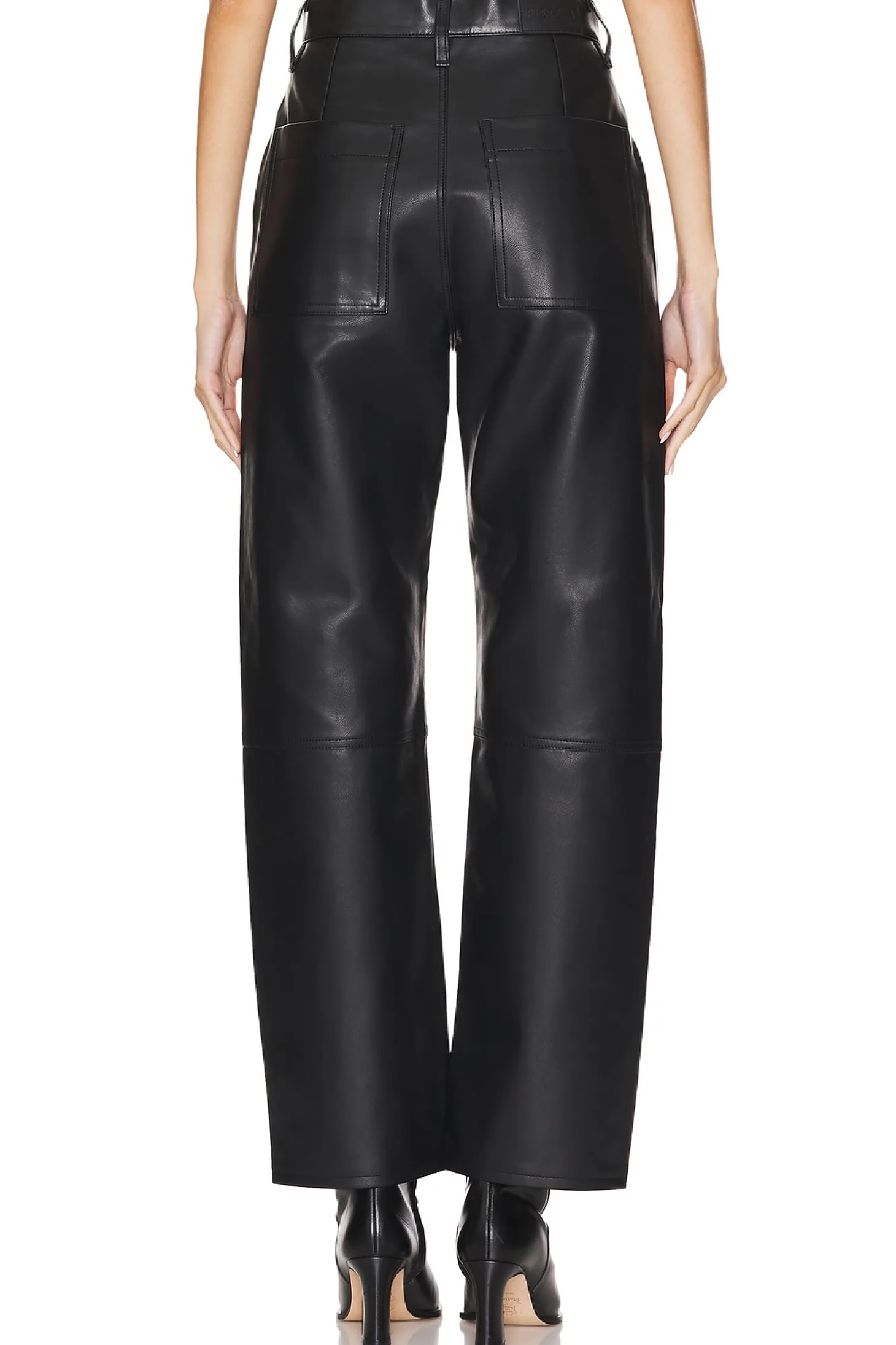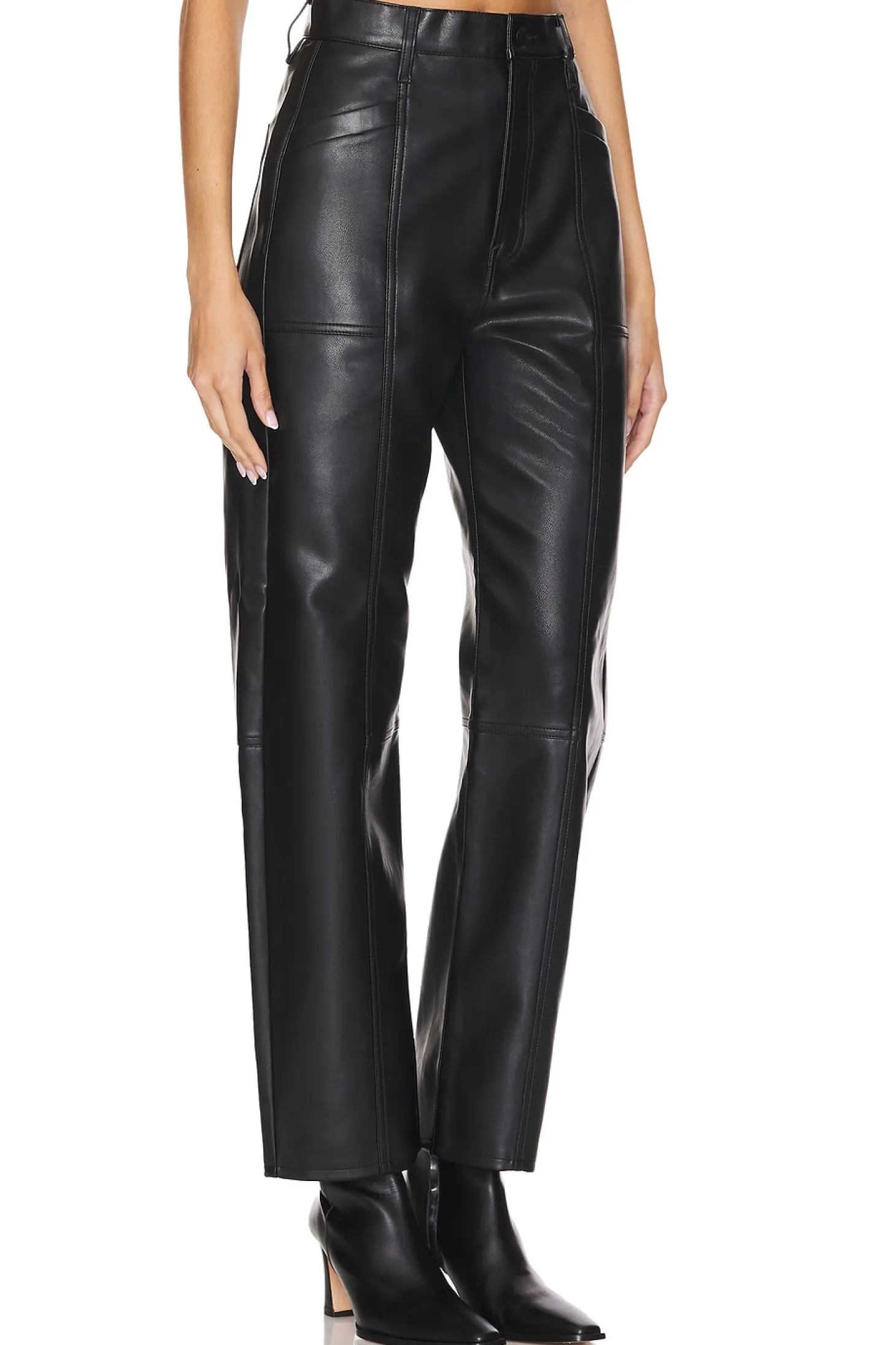 100% polyurethane.Made in China.Machine wash.Zip fly with button closure.4 pocket styling.9.5" at the knee and narrows to 8.5" at the leg opening`