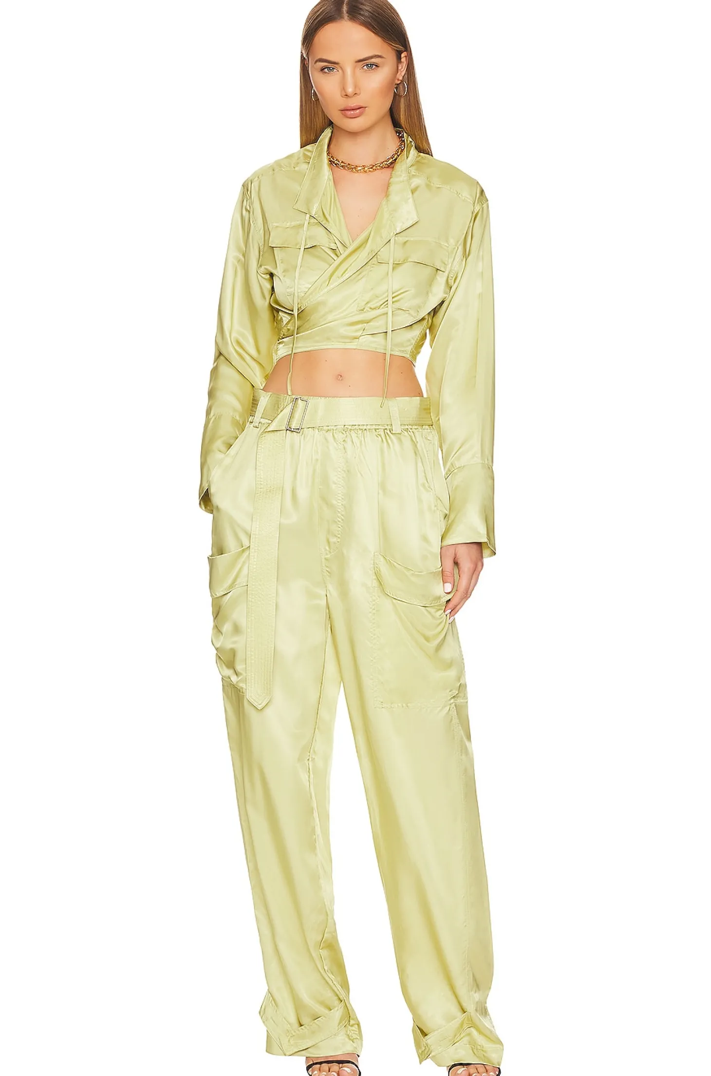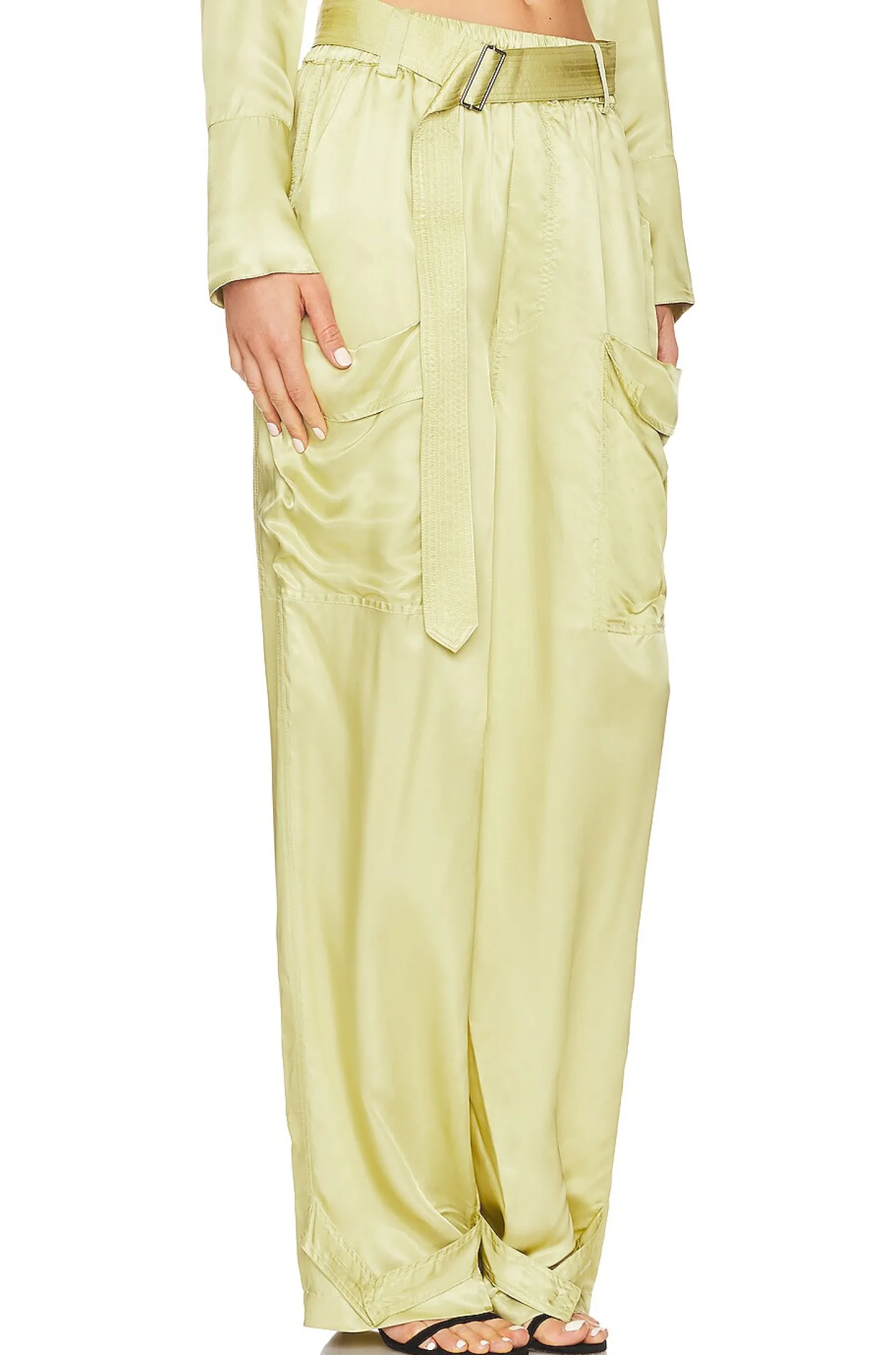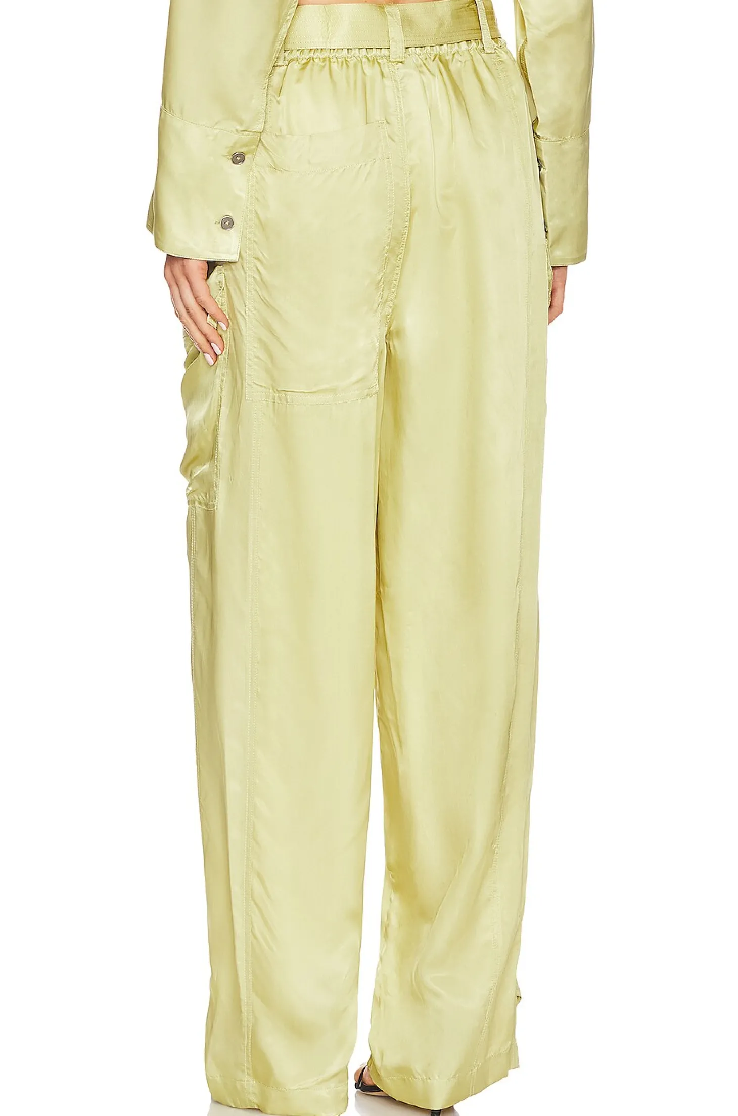 100% viscose.Made in China.Dry clean only.Elastic waistband with detachable waist belt.5-pocket styling.Button tabs at hem.Midweight satin fabric Item not sold as a set.17" at the knee narrows to 14" at the leg opening