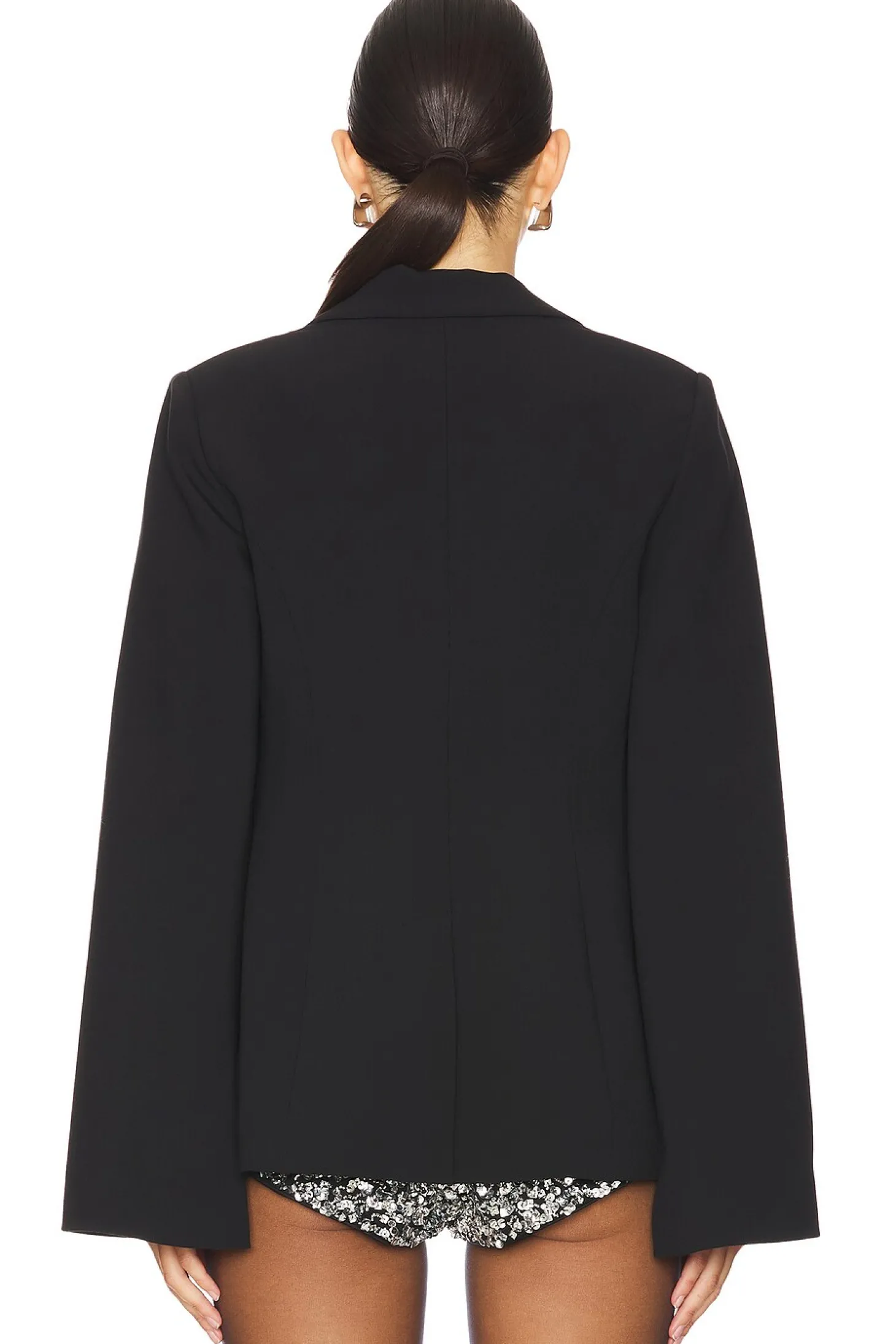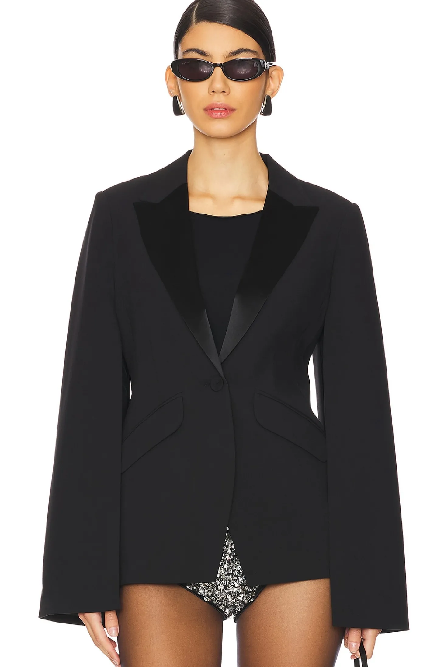 Self: 74% polyester 20% rayon 6% elastane Lining: 100% polyester Contrast Fabric: 75% acetate 25% polyester.Made in China.Dry clean only.Front button closure.Front faux flap pockets and padded shoulders.Heavyweight suit fabric with split sleeves