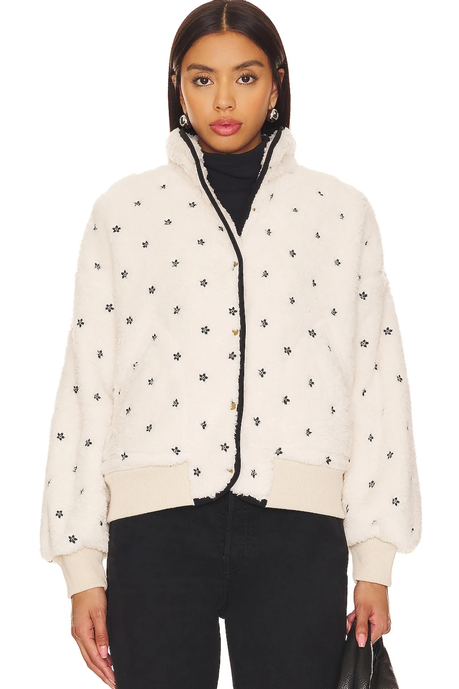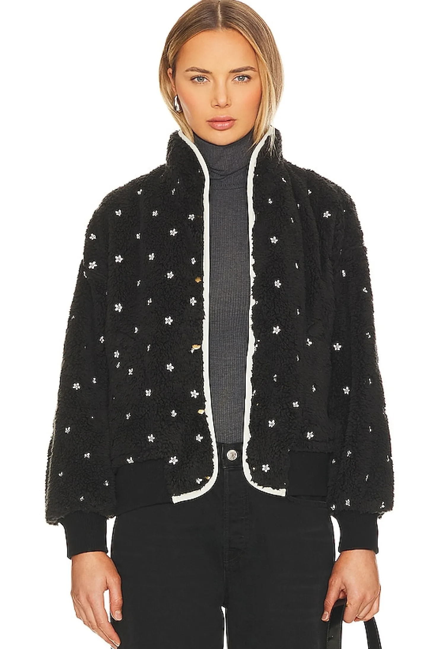 Self: 100% polyester Contrast Fabric: 100% cotton Rib: 80% cotton 20% elastane.Made in China.Machine wash.Front button closure.Side slant pockets.Ribbed cuffs and hem.High pile fleece fabric