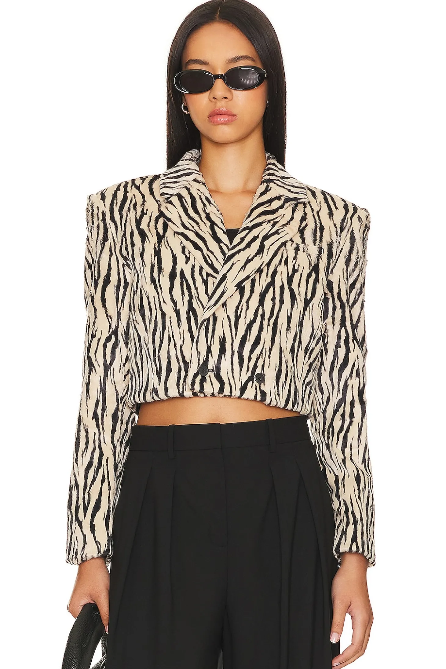 Self: 45% cotton 36% viscose 19% polyester Lining: 100% polyester.Made in China.Dry clean only.Singular front button closure.Padded shoulders.Soft faux fur fabric