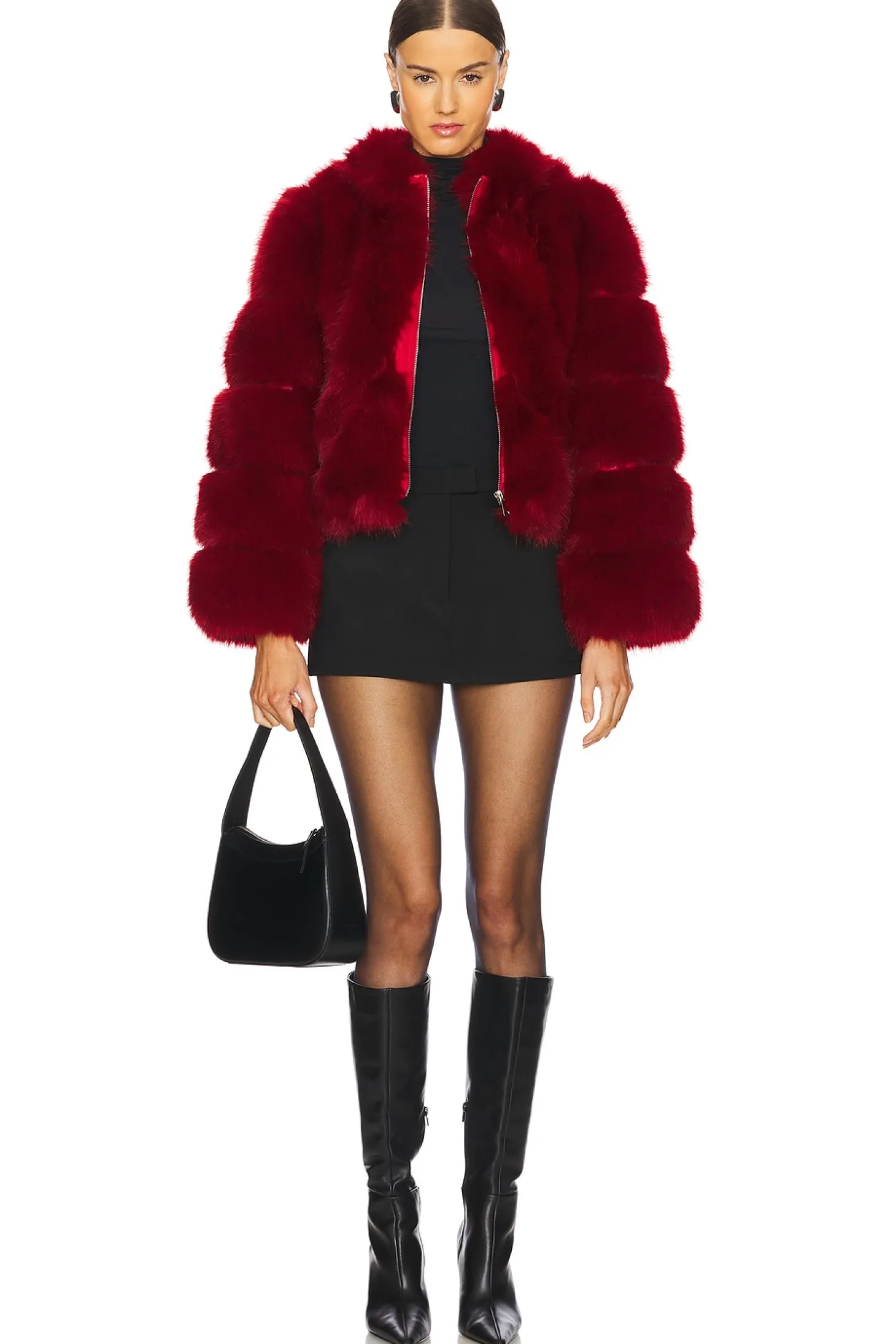 Self 1 & Lining: 100% polyester Self 2: 100% polyurethane.Made in China.Dry clean only.Exposed front zipper closure.Side zipper pockets.Faux leather and faux fur fabric