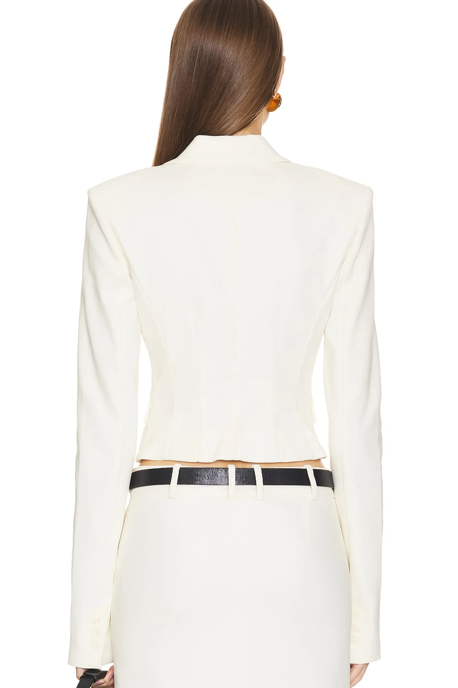 58% nylon 39% cotton 3% elastane.Made in China.Dry clean only.Front button closure.Padding at shoulders and buttoned cuffs.Side flap pockets.Crepe fabric