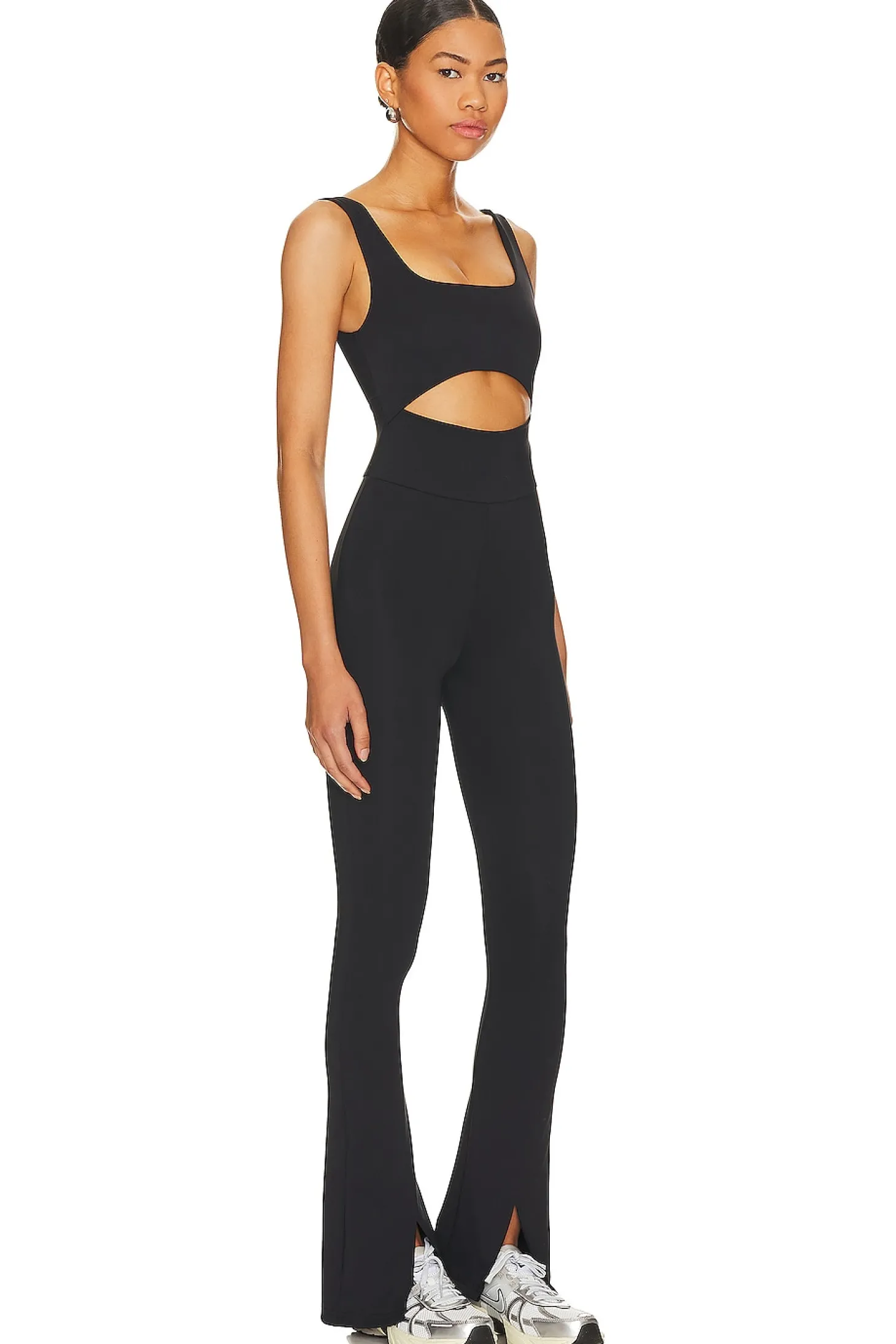 76% polyester 24% spandex.Made in USA.Machine wash.Pull-on styling.Front cut-out.Split cuffs.Stretch fit