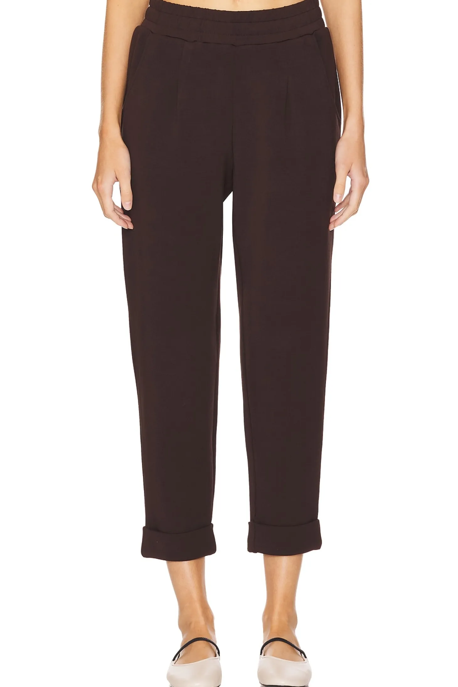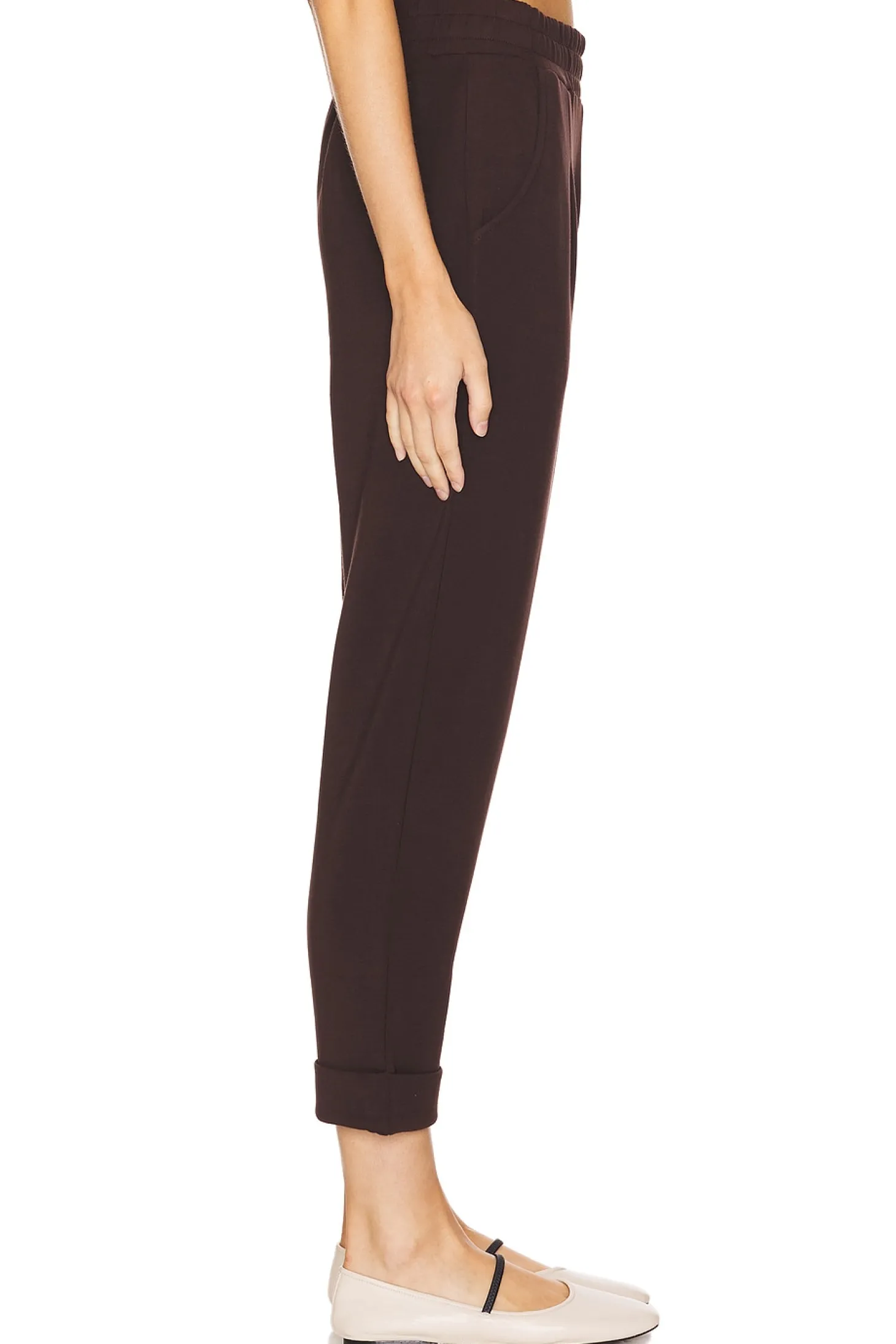 72% viscose 23% polyester 5% elastane.Made in China.Machine wash.Interior elastic drawstring.Side slant pockets.Midweight jersey fabric.17" at the knee narrows to 13" at the leg opening