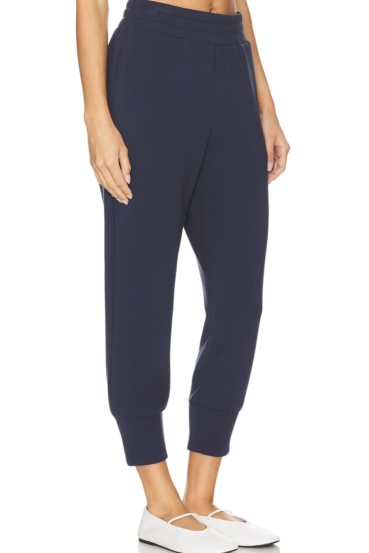 72% viscose 23% polyester 5% elastane.Made in China.Machine wash recommended.Interior elastic drawstring closure.Side seam pockets.Jersey fabric.Item not sold as set.18" at the knee narrows to 10" at the leg opening