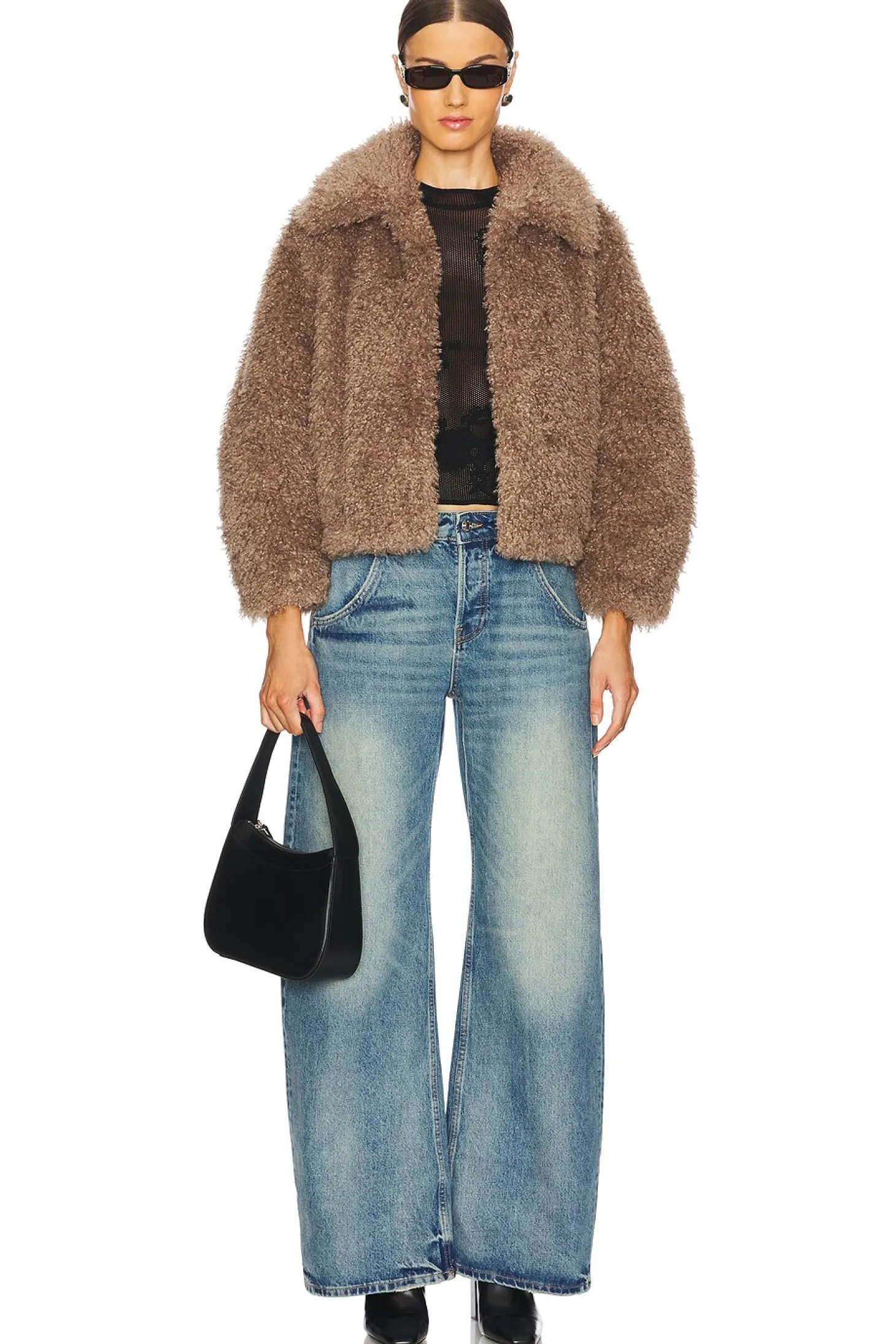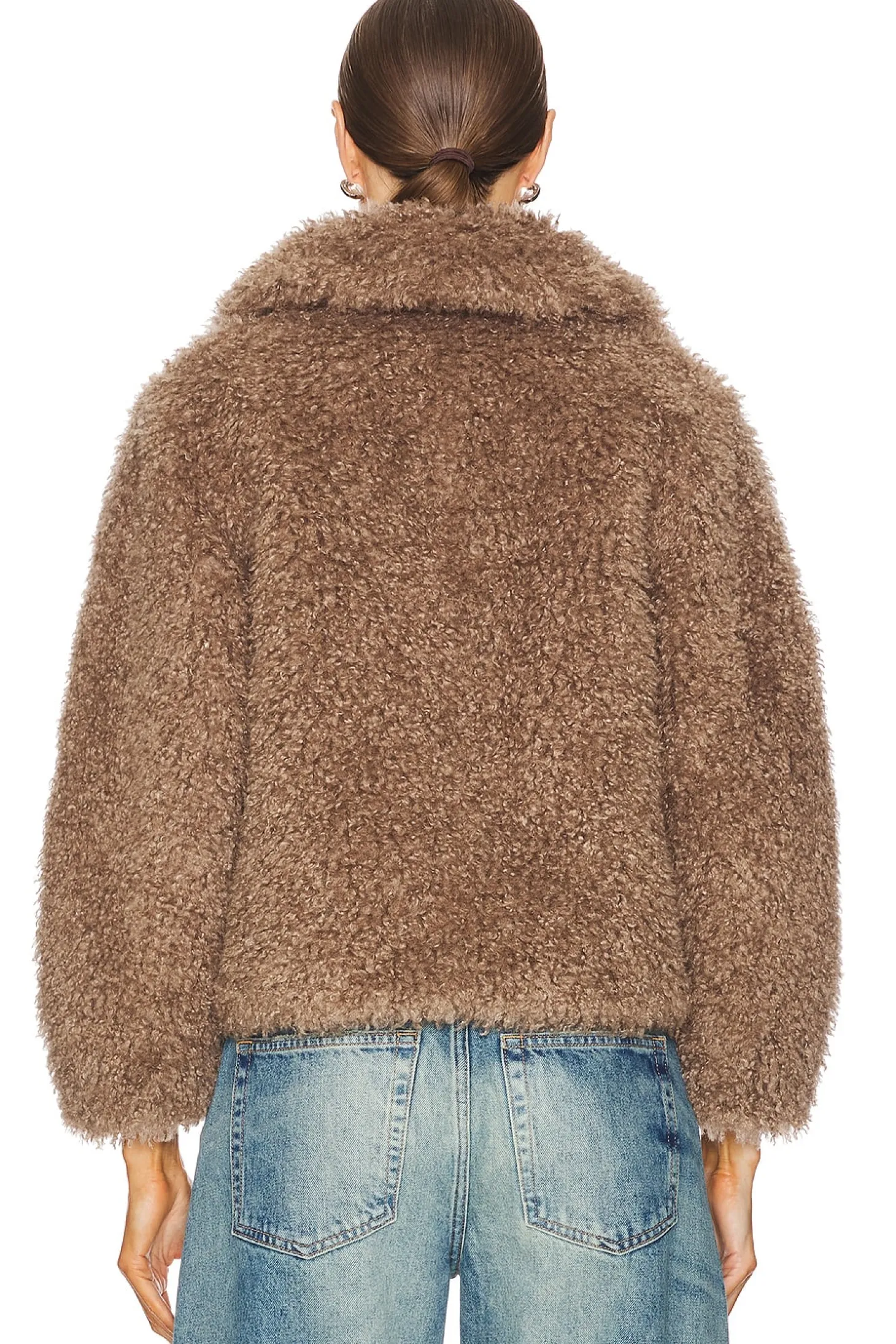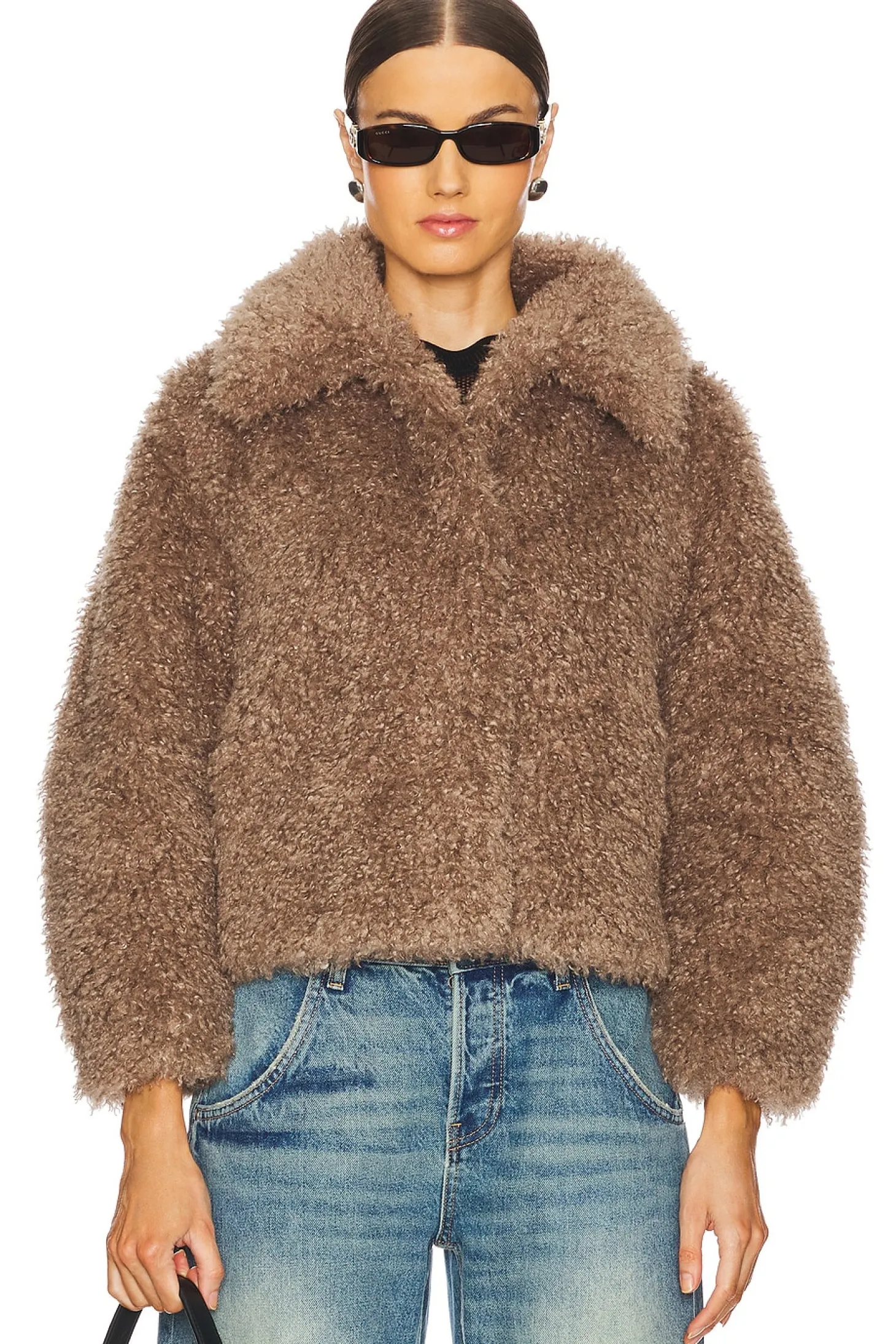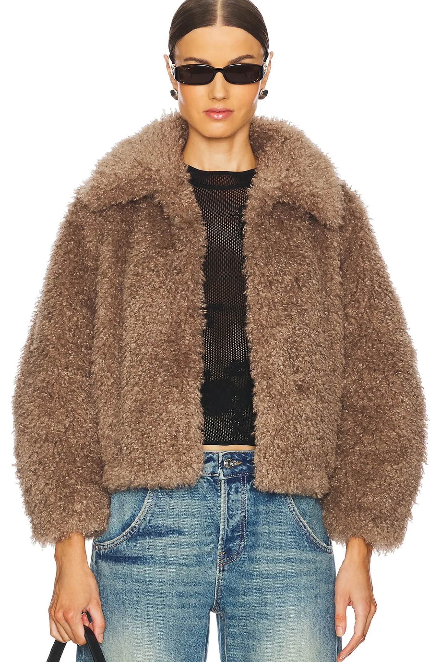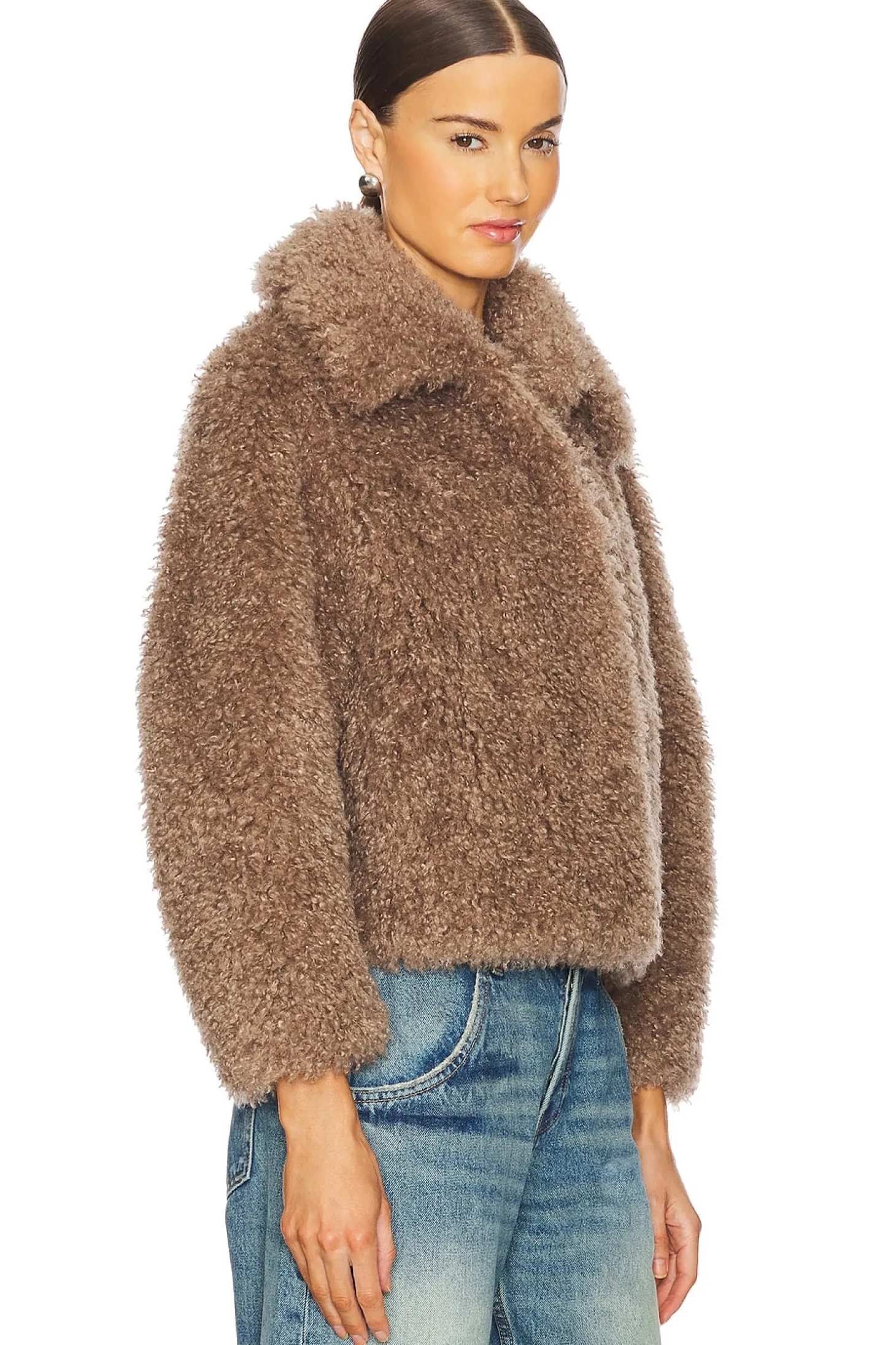 Self & Lining: 100% polyester.Made in China.Dry clean only.Front singular hook and eye closure.Side seam pockets.Faux fur fabric