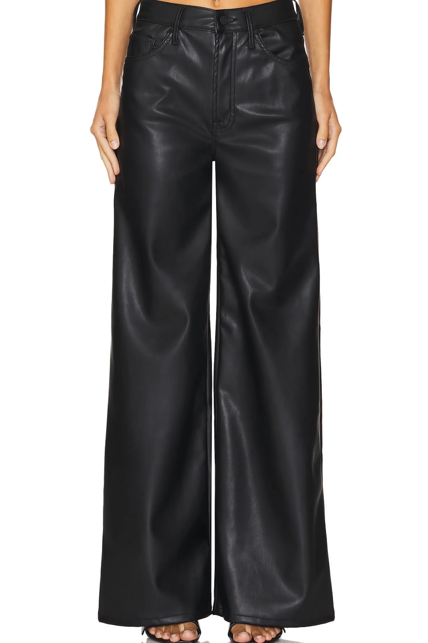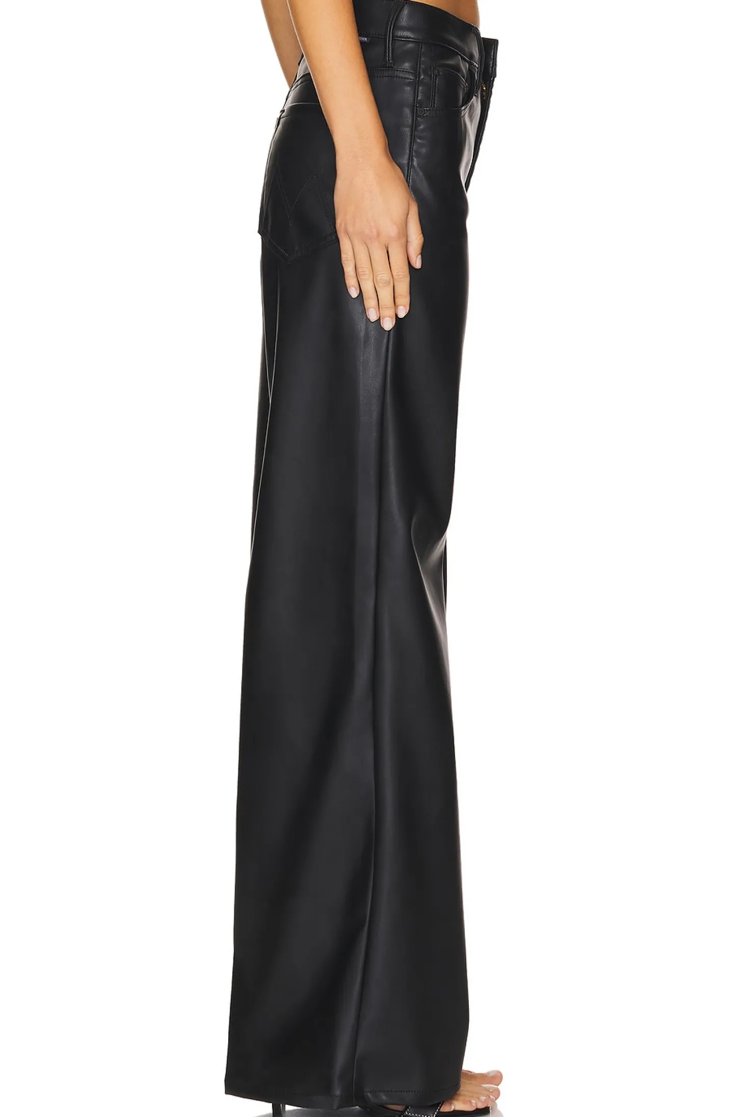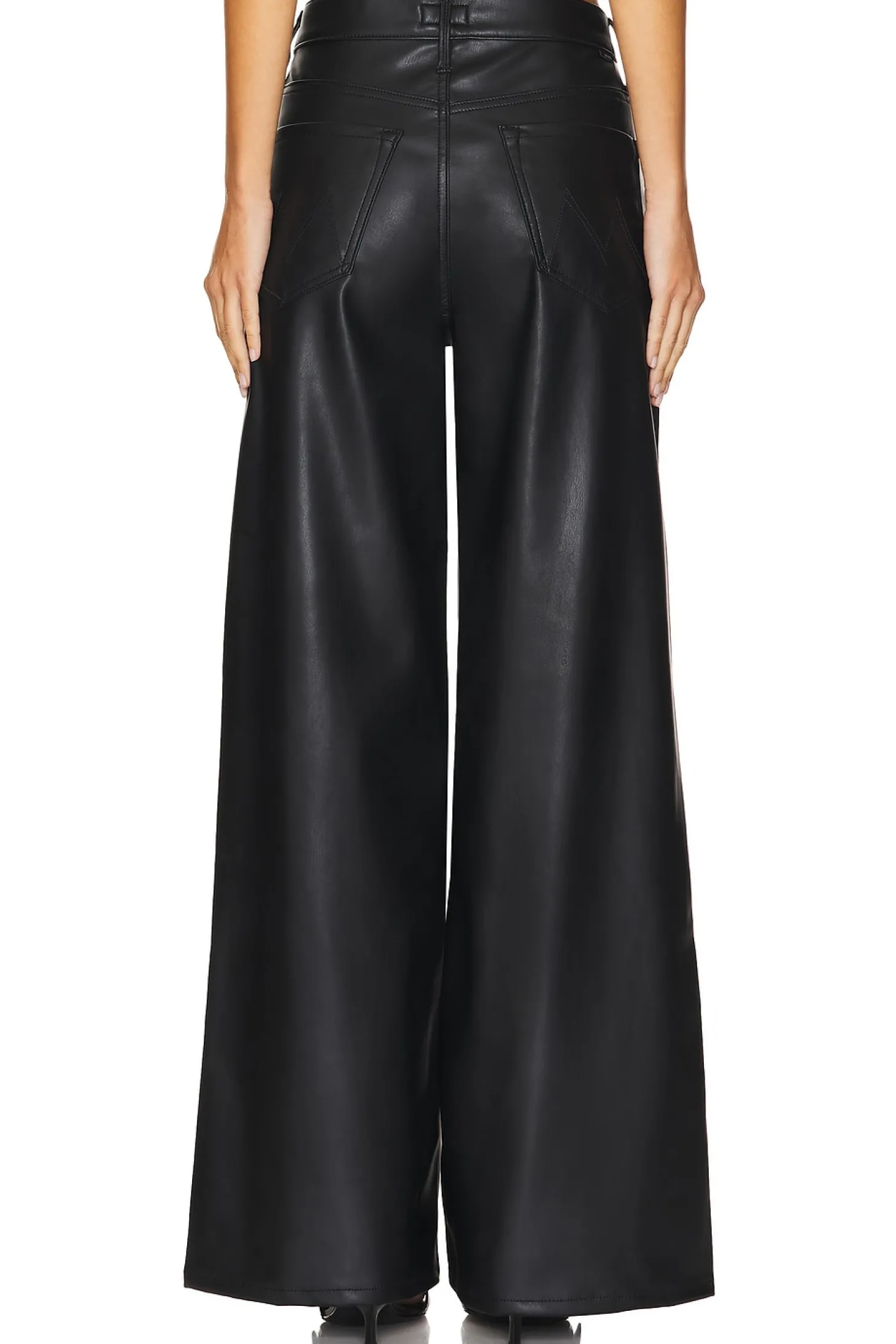 Self 1: 100% polyurethane Self 2: 100% polyester.Made in USA.Hand wash.Zip fly and button closure.5-pocket design.Faux leather.23" at the knee breaks to 26" at the leg opening