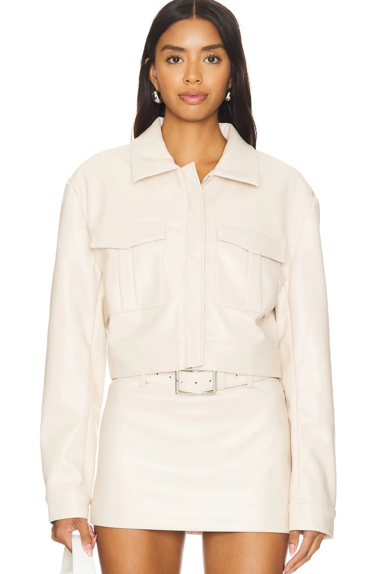 Leather textile.Imported.Dry clean recommended.Front zipper closure.Front flap pockets.Midweight smooth fabric.Item not sold as a set