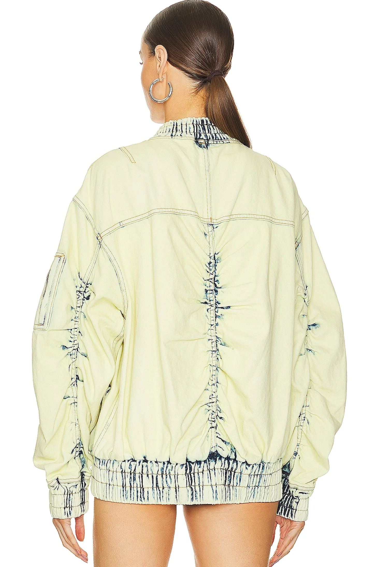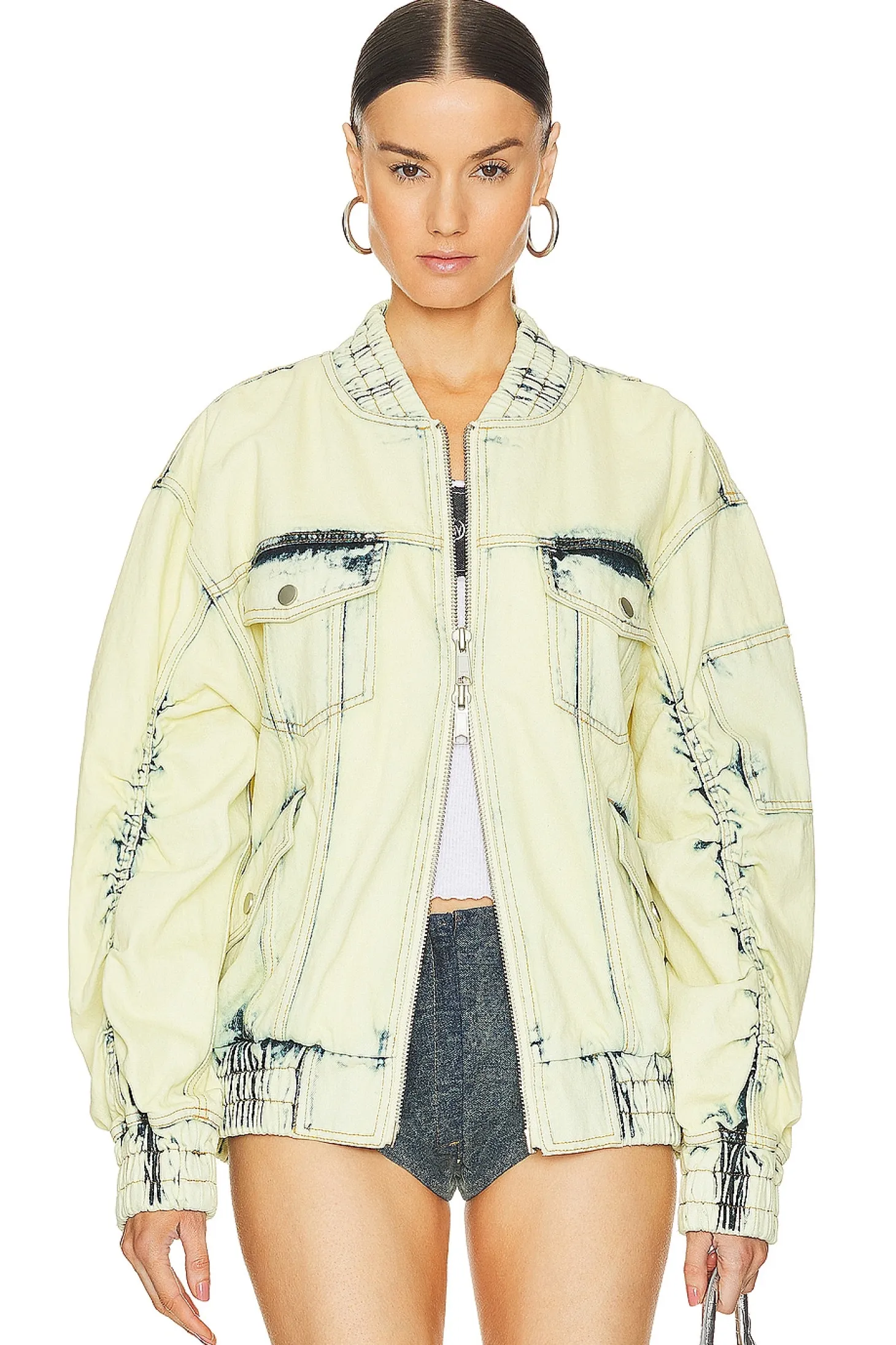 100% cotton.Made in China.Dry clean only.Front zipper closure.4-pocket design.Smocked cuffs.Midweight denim fabric