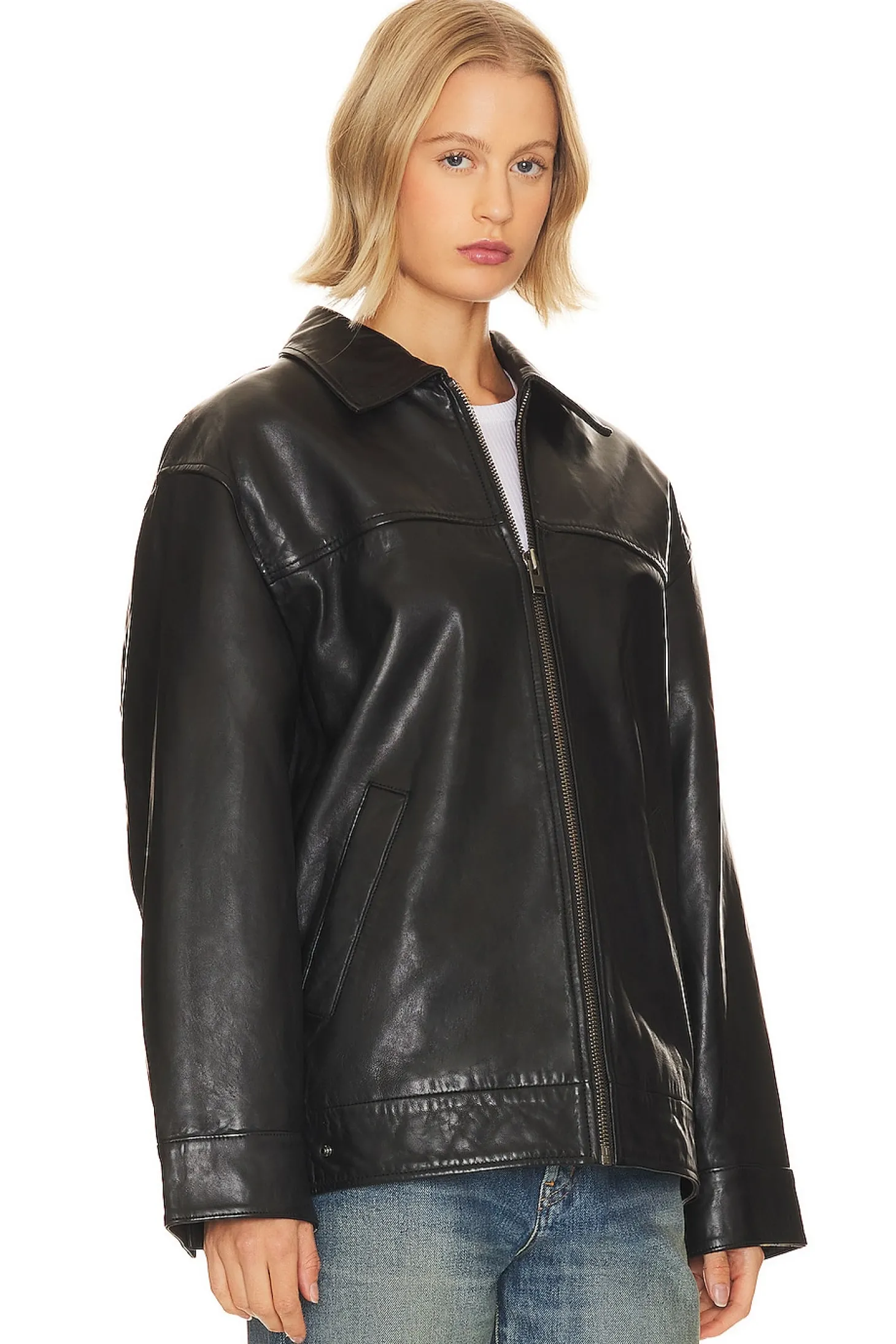 Self: 100% lamb leather Lining: 100% polyester.Made in India.Dry clean only.Front zipper closure.Side slip pockets.Oversized fit