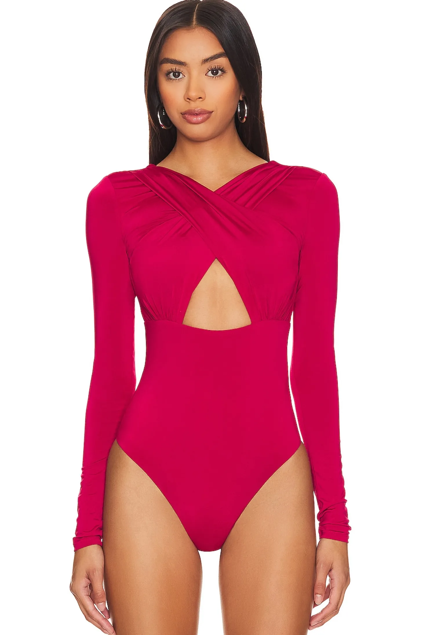 Make a statement with the Tigre Bodysuit in Dark Red. Made from high-shine jersey fabric, it features bold front and back cut-outs that exude feminine confidence. Radiating in a vibrant hue, this bodysuit promises to turn heads and elevate your night-out ensemble..93% polyester 7% elastane.Made in China.Hand wash.Gusset snap button closure with back keyhole closure.High shine jersey fabric with front and back cut-outs