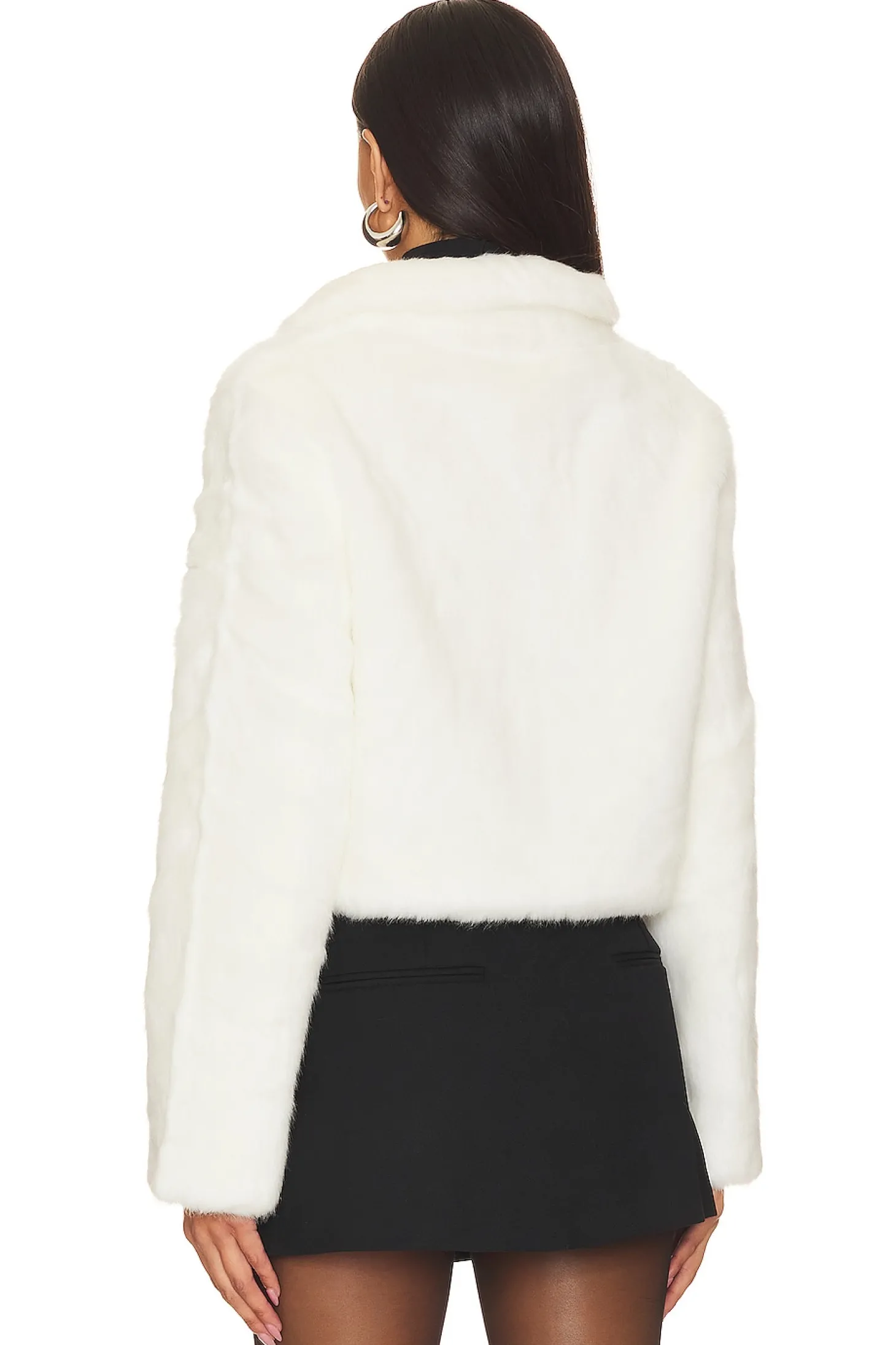 Self: 100% acrylic Lining: 95% polyester 5% elastane.Made in China.Dry clean only.Front hook and bar closure.Fuzzy faux fur fabric