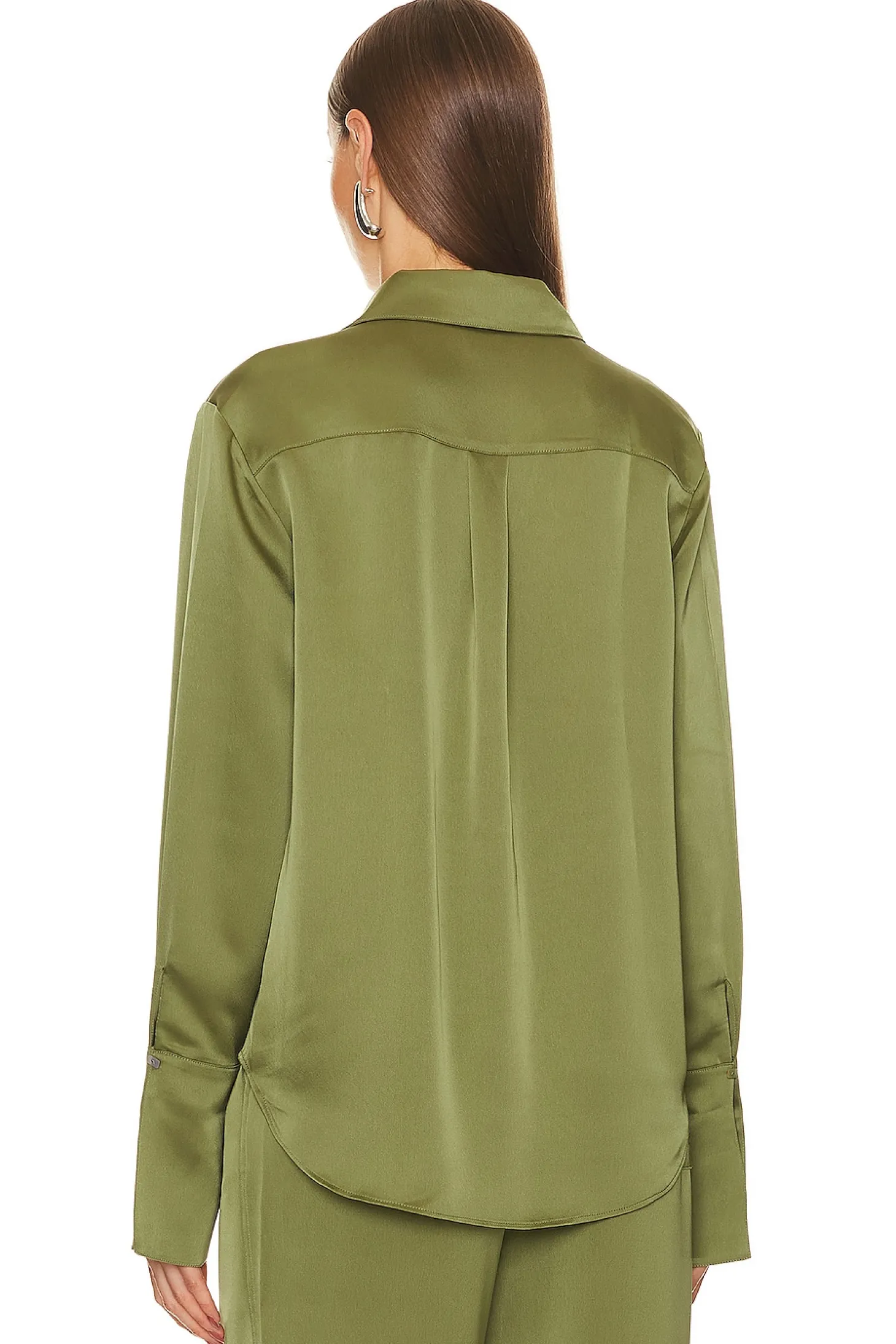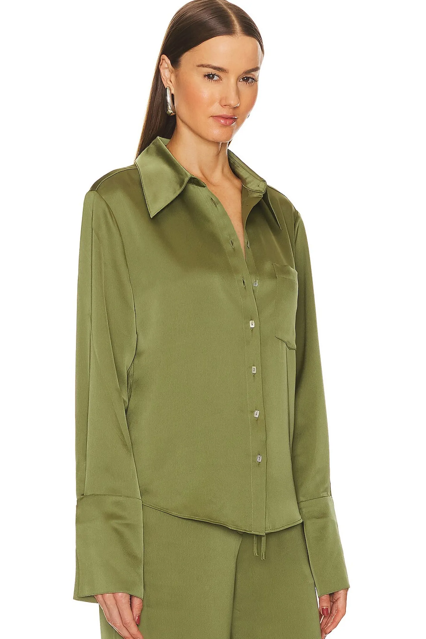 100% polyester.Made in China.Hand wash.Front button closure with button cuffs.Breast slip pocket with embroidered logo.Satin fabric with oversized styling.Item not sold as set