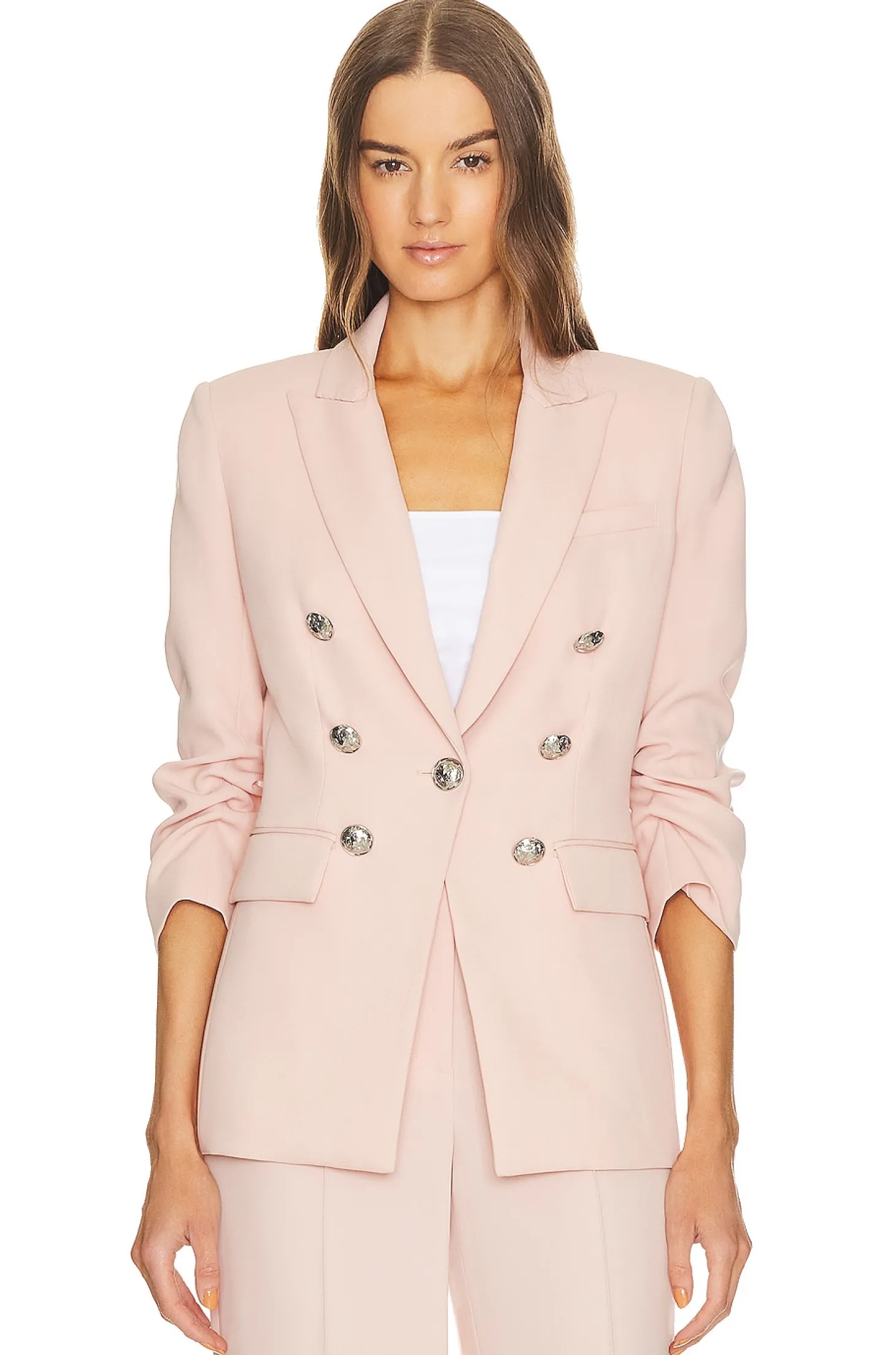Polyester blend.Imported.Dry clean recommended.Singular front button with double-breasted design.Padded shoulders Ruched sleeves.Breast slip pocket Side flap pockets.Buttoned cuffs.Crepe fabric Item not sold as a set