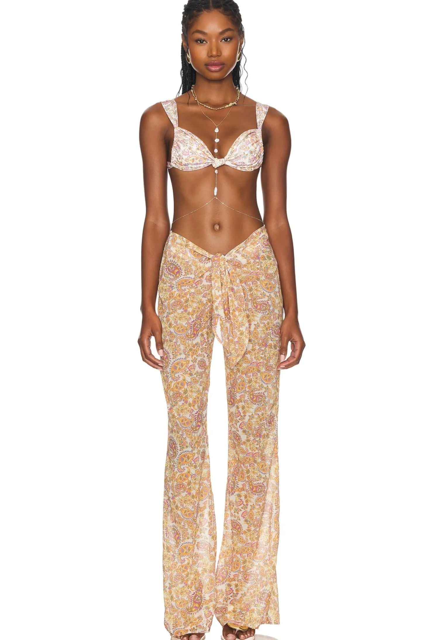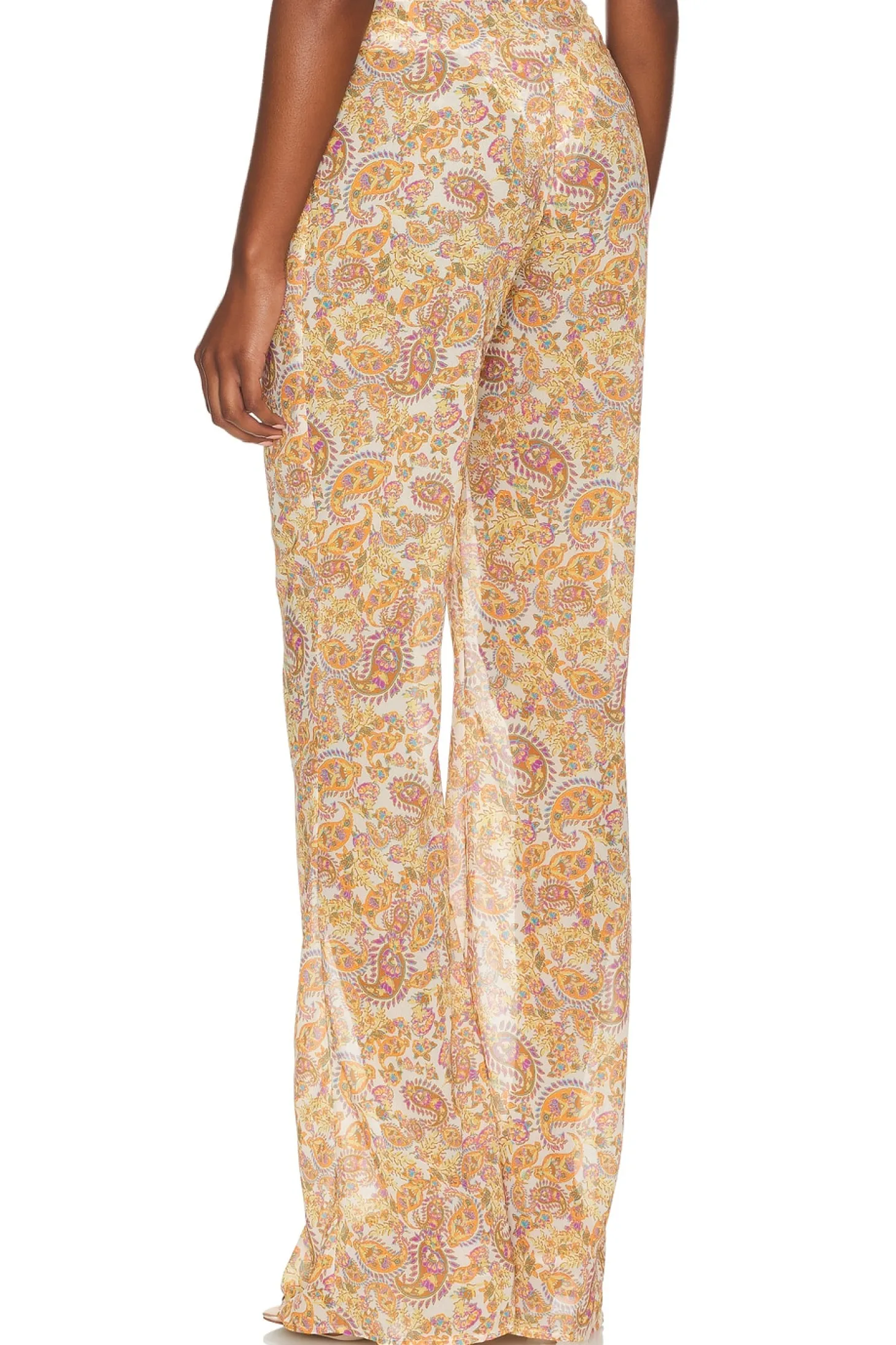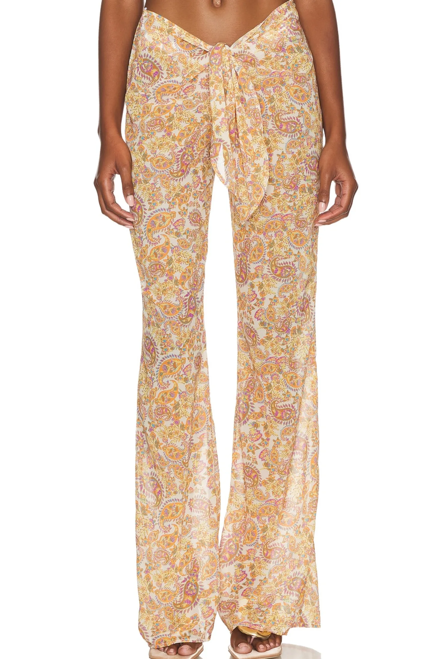 100% polyester.Made in Thailand.Hand wash.Pull-on styling.Tie closure at the waist.Garment is made with a semi-sheer fabric, undergarments can show through.16" at the knee breaks to 22" at the leg opening