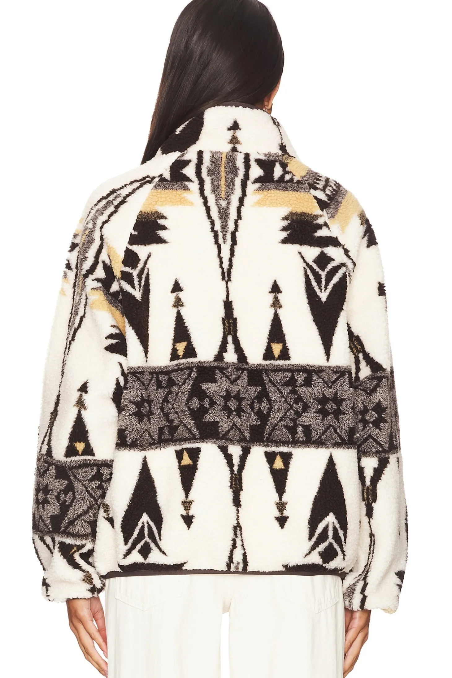 Self: 100% recycled polyester Lining: 100% organic cotton.Made in China.Machine wash.Exposed front zip closure.Side pockets and single breast pocket with zip closure.Elastic cuffs and hem.Sherpa fabric